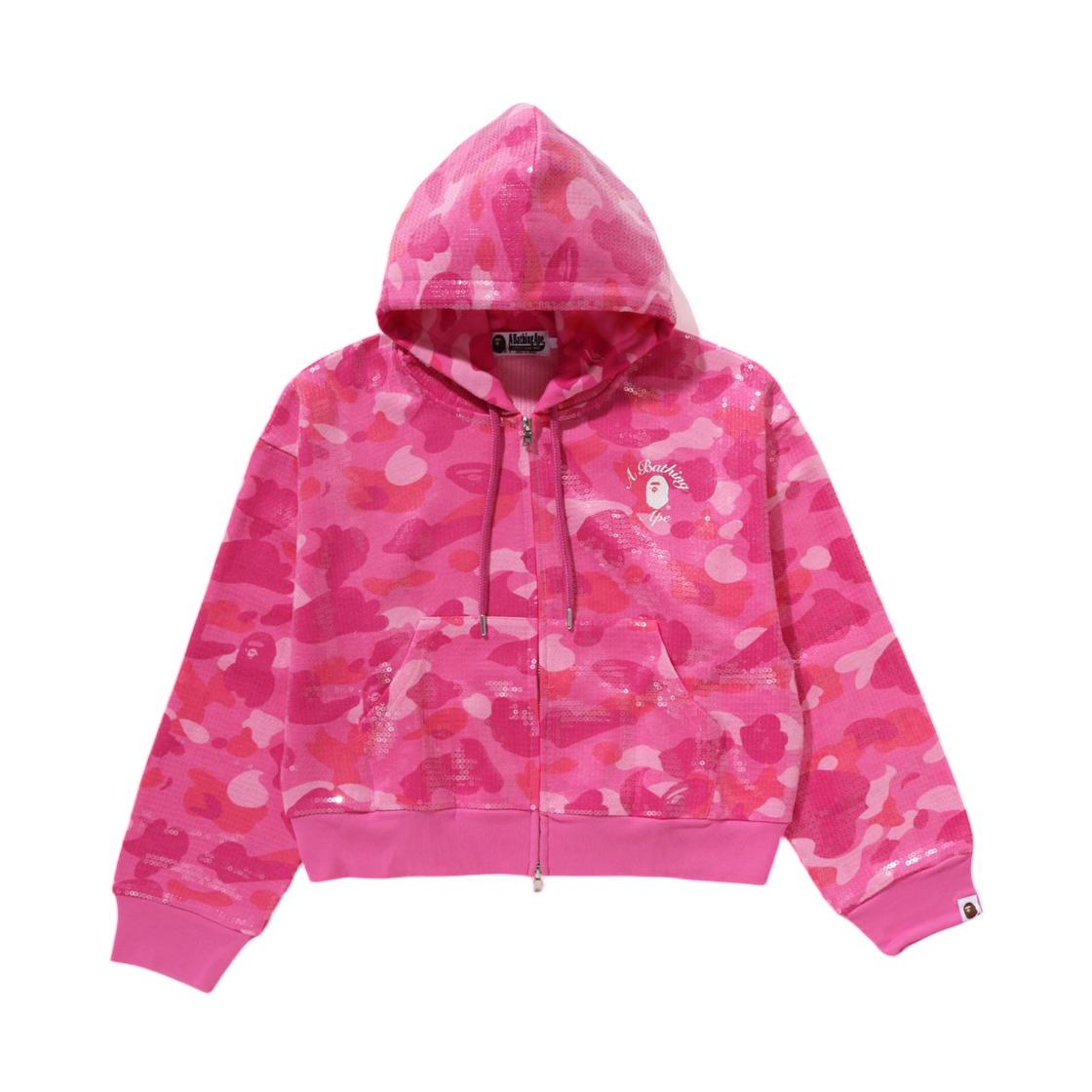 (W) 베이프 컬러 카모 에이프 헤드 시퀸 크롭 풀 집 후드 핑크
