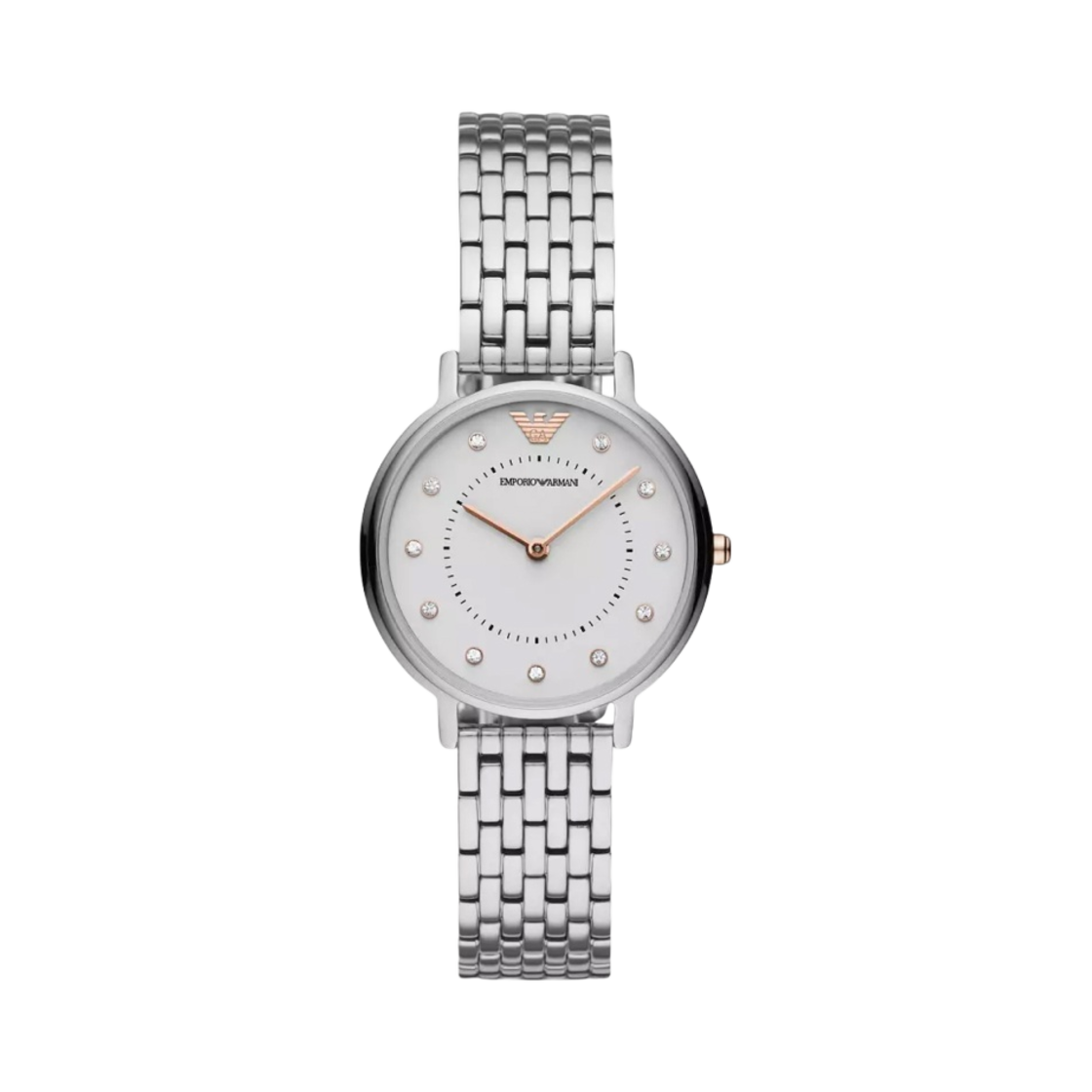 (W) 엠포리오 아르마니 쿼츠 투핸드 32mm 스테인리스 스틸 브레이슬릿 이어링 세트 화이트 실버