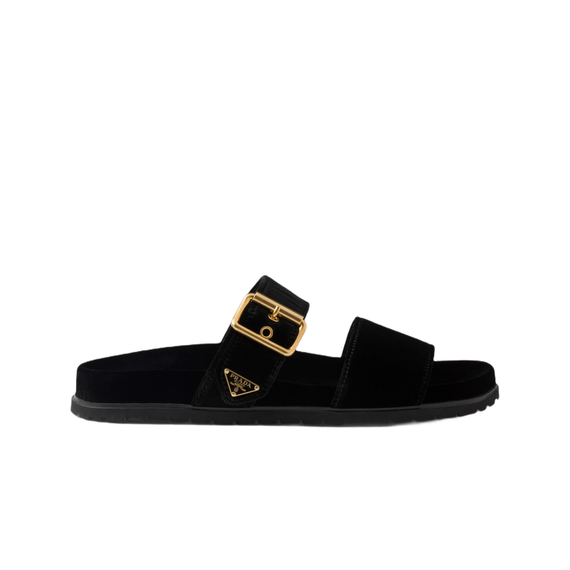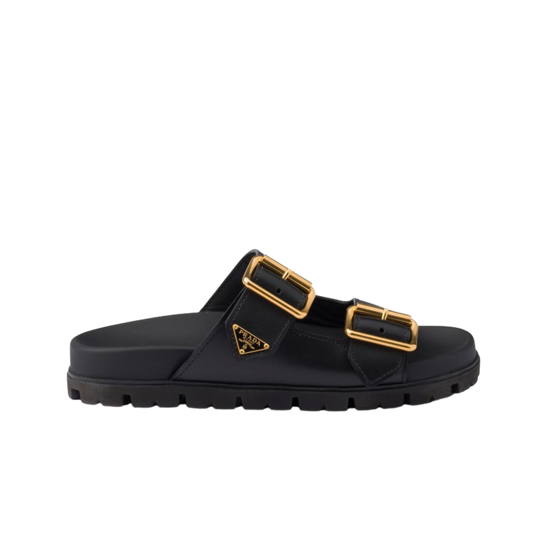 (W) 프라다 가죽 스트랩 슬라이드 블랙