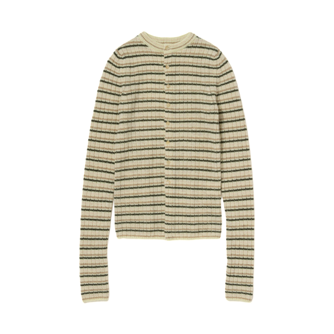 (W) 오라리 셰틀랜드 울 캐시미어 립 니트 크루넥 가디건 베이지 스트라이프 - 25AW