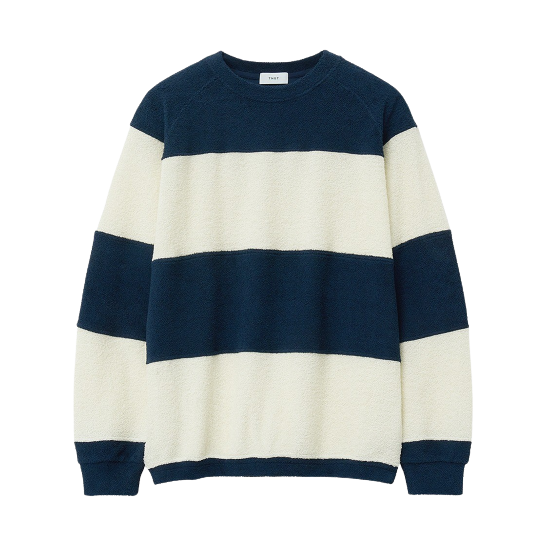 티엔지티 오버핏 테리 스트라이프 부클 맨투맨 네이비