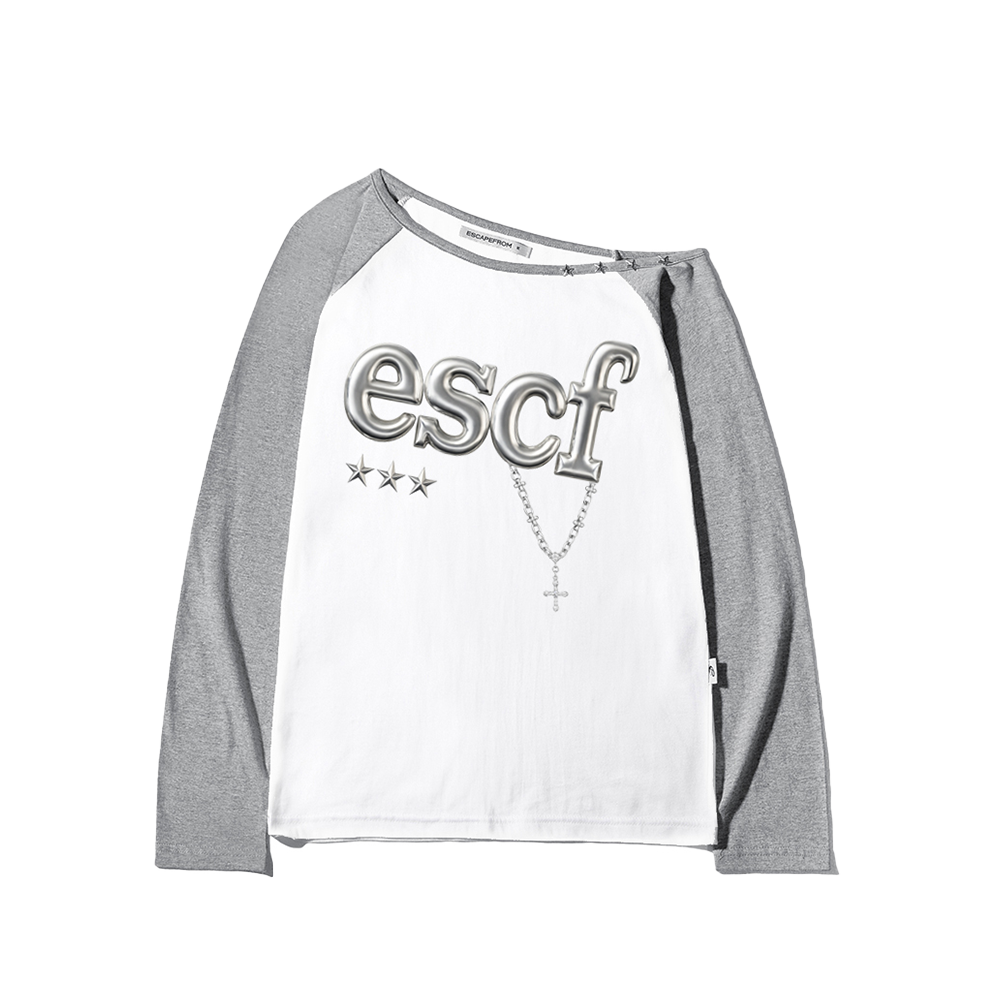 이스케이프프롬 메탈 크로스 키링 프린트 별 리벳 포인트 원숄더 롱슬리브 그레이