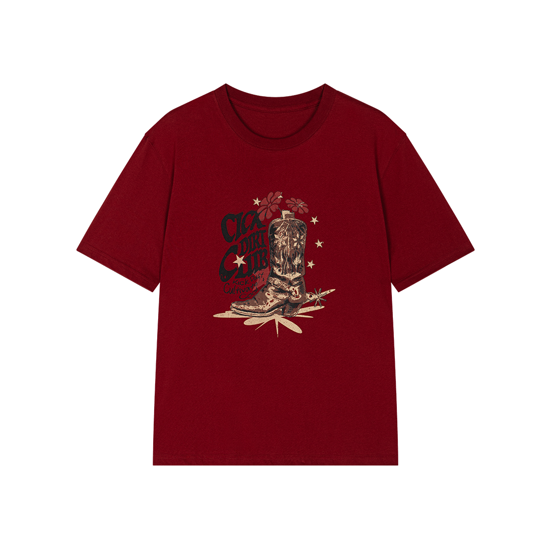 웨이비니스 웨스턴 부츠 그래픽 티셔츠 버건디
