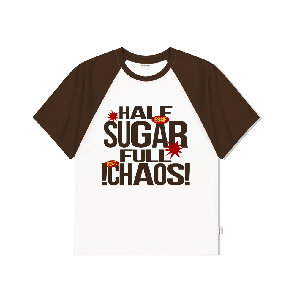 이스케이프프롬 하프 슈거 풀 카오스 프린트 래글런 배색 반팔티 브라운