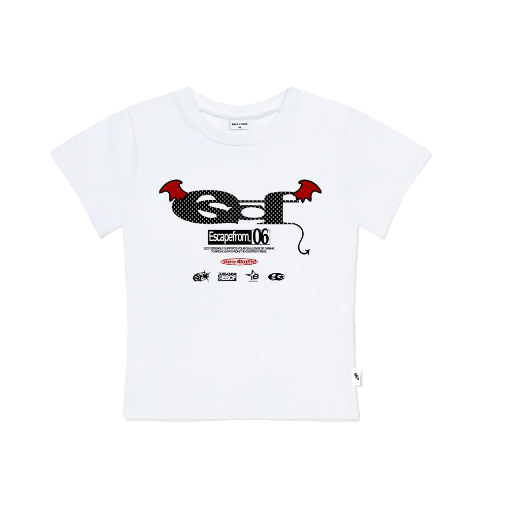 이스케이프프롬 데빌 ESCF 로고 콜라주 프린트 슬림핏 반팔티 화이트