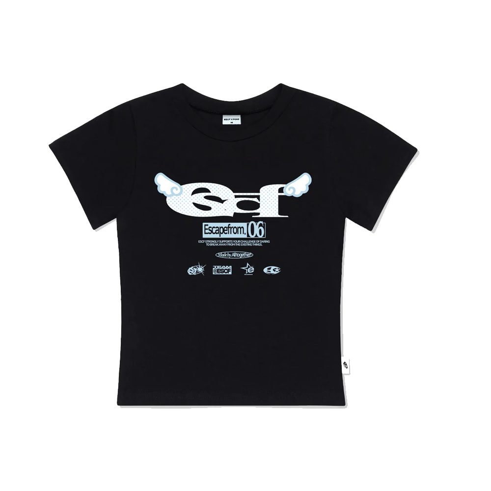 이스케이프프롬 엔젤 ESCF 로고 콜라주 프린트 슬림핏 반팔티 블랙