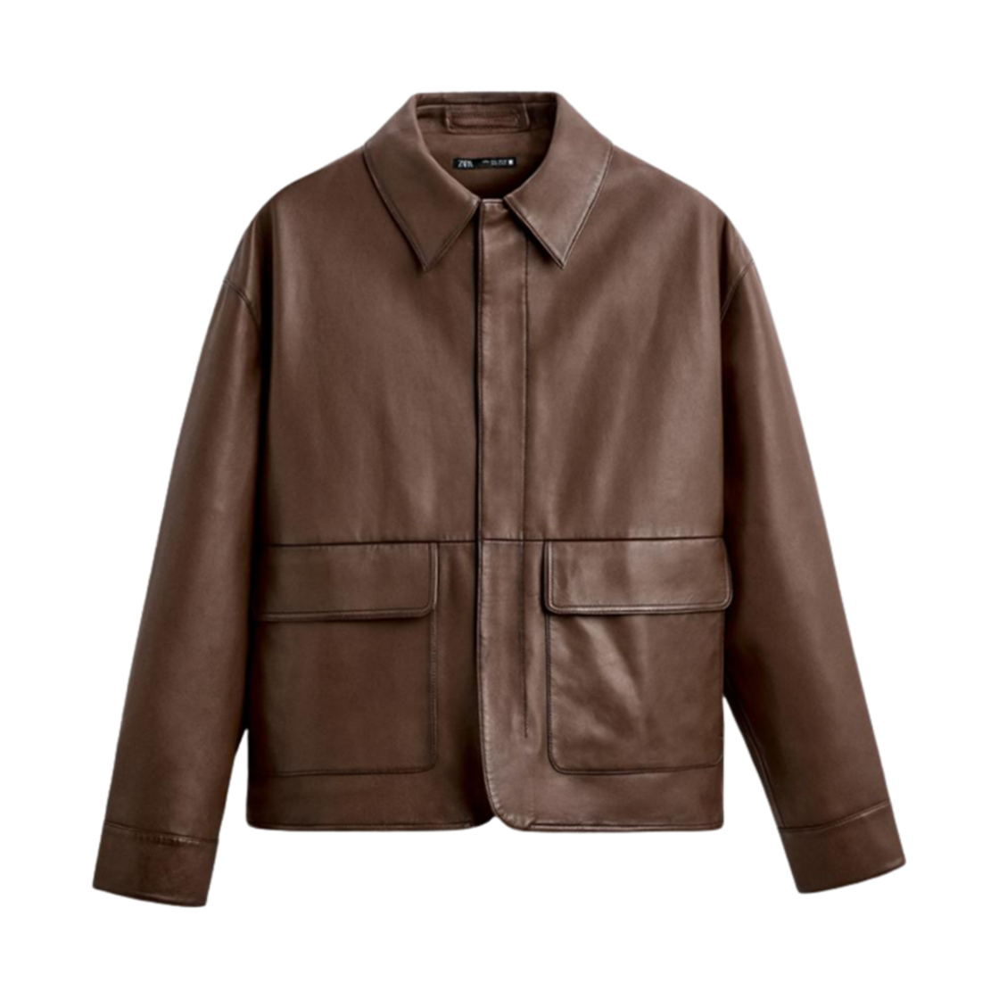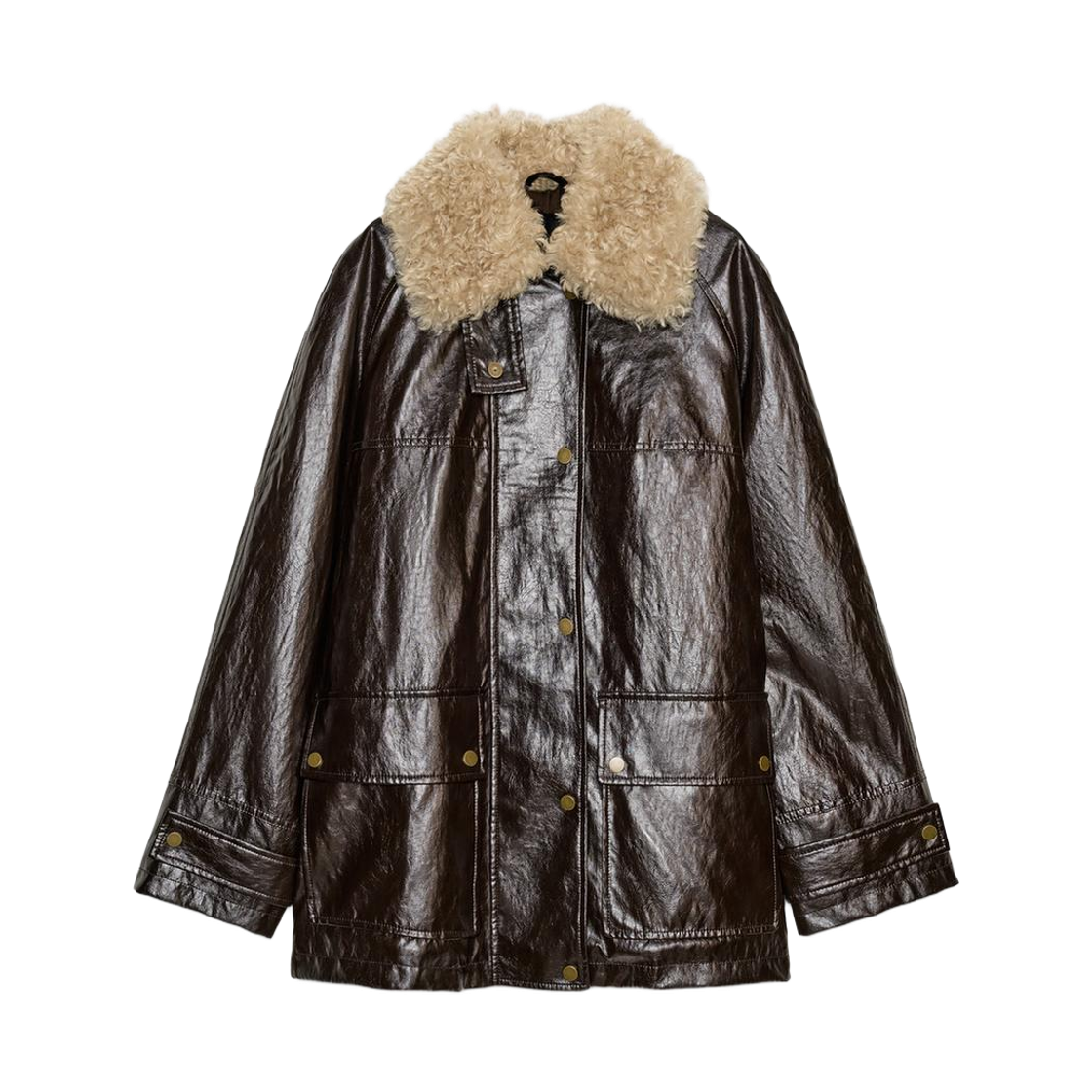 자라 콘트라스트 페이크 레더 자켓 브라운