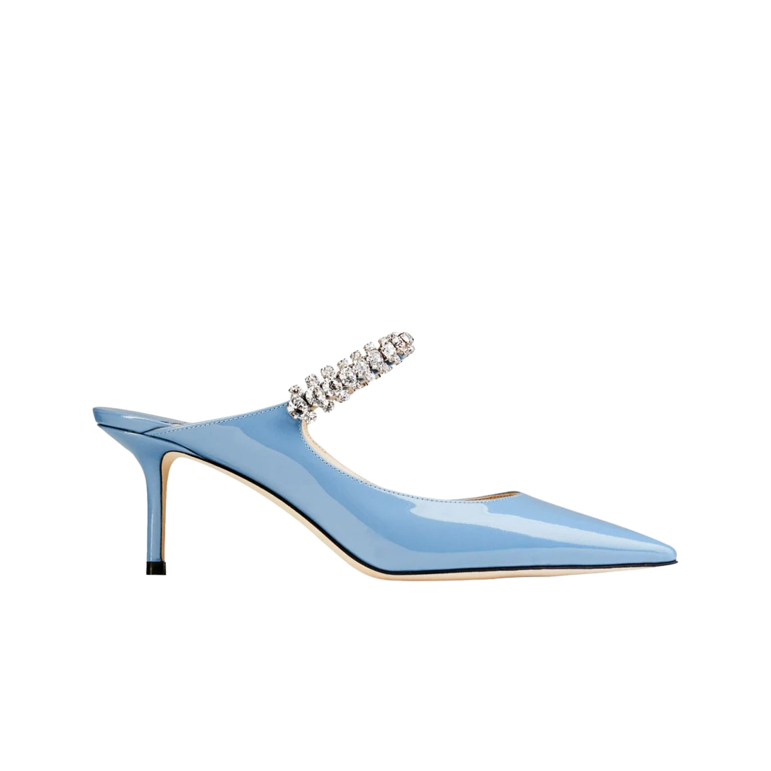 (W) 지미추 빙 65 페이턴트 레더 뮬 크리스탈 스트랩 스모키 블루