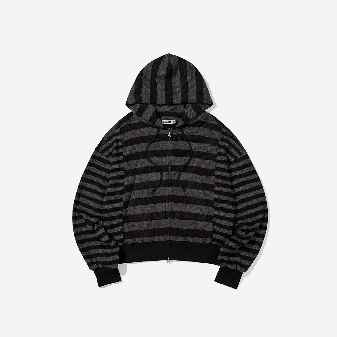카락터 스트라이프드 니트 후드 집업 블랙 차콜