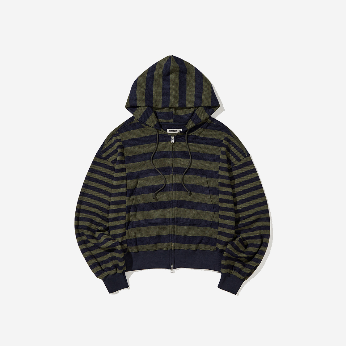 카락터 스트라이프드 니트 후드 집업 카키 블루