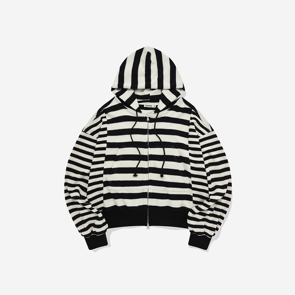 카락터 스트라이프드 니트 후드 집업 아이보리 블랙