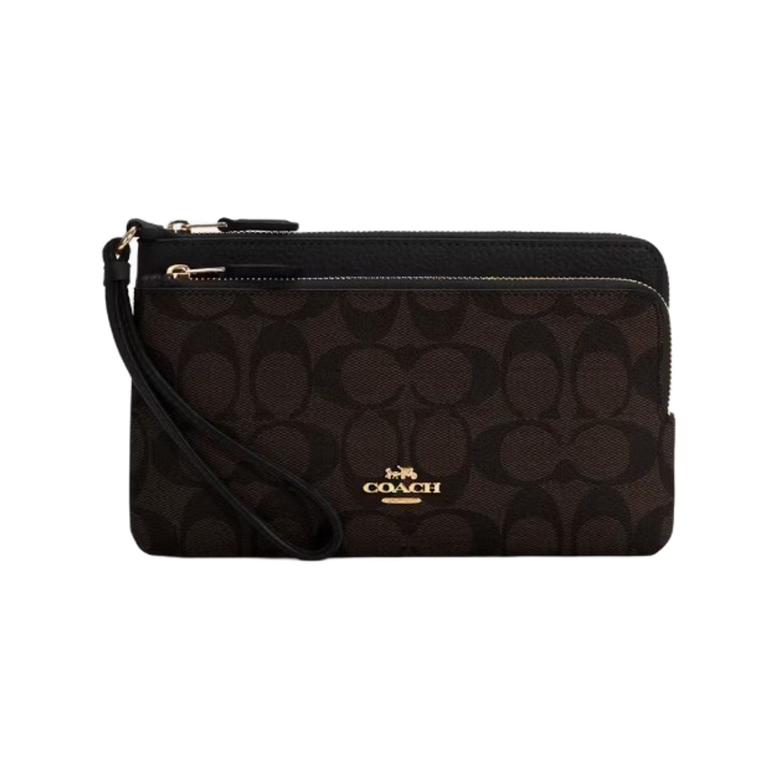 코치 시그니처 캔버스 더블 집 월렛 골드 브라운 블랙