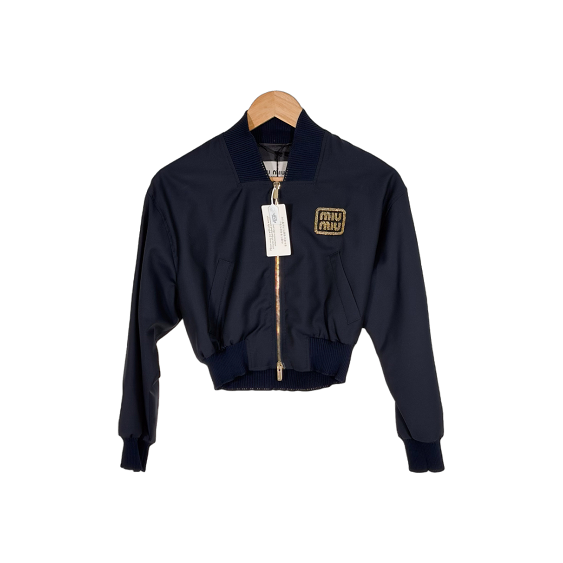 미우미우 24ss 여성 크롭 바타비아 봄버 바시티 자켓 네이비