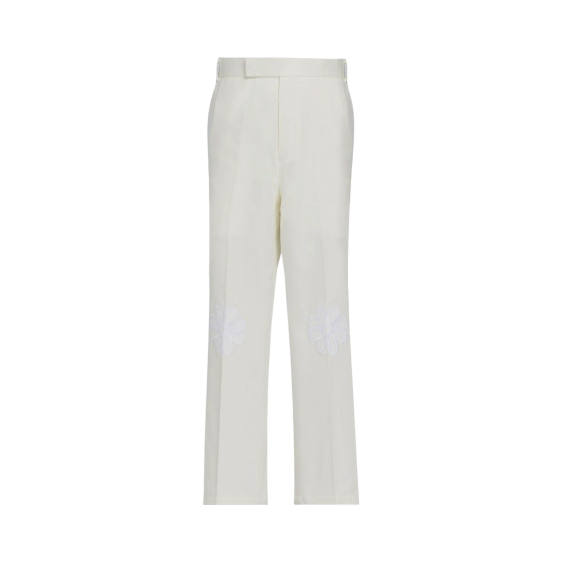 톰브라운 사틴 스티치 플로랄 아플리케 니 패치 언컨스트럭티드 벨트 루프 트라우저 화이트