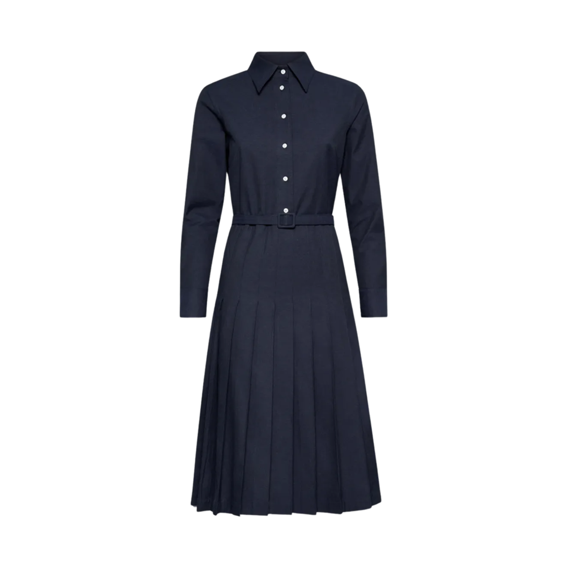 (W) 톰브라운 스트라이프 코튼 플란넬 미디 플리츠 바텀 벨트 드레스 블루