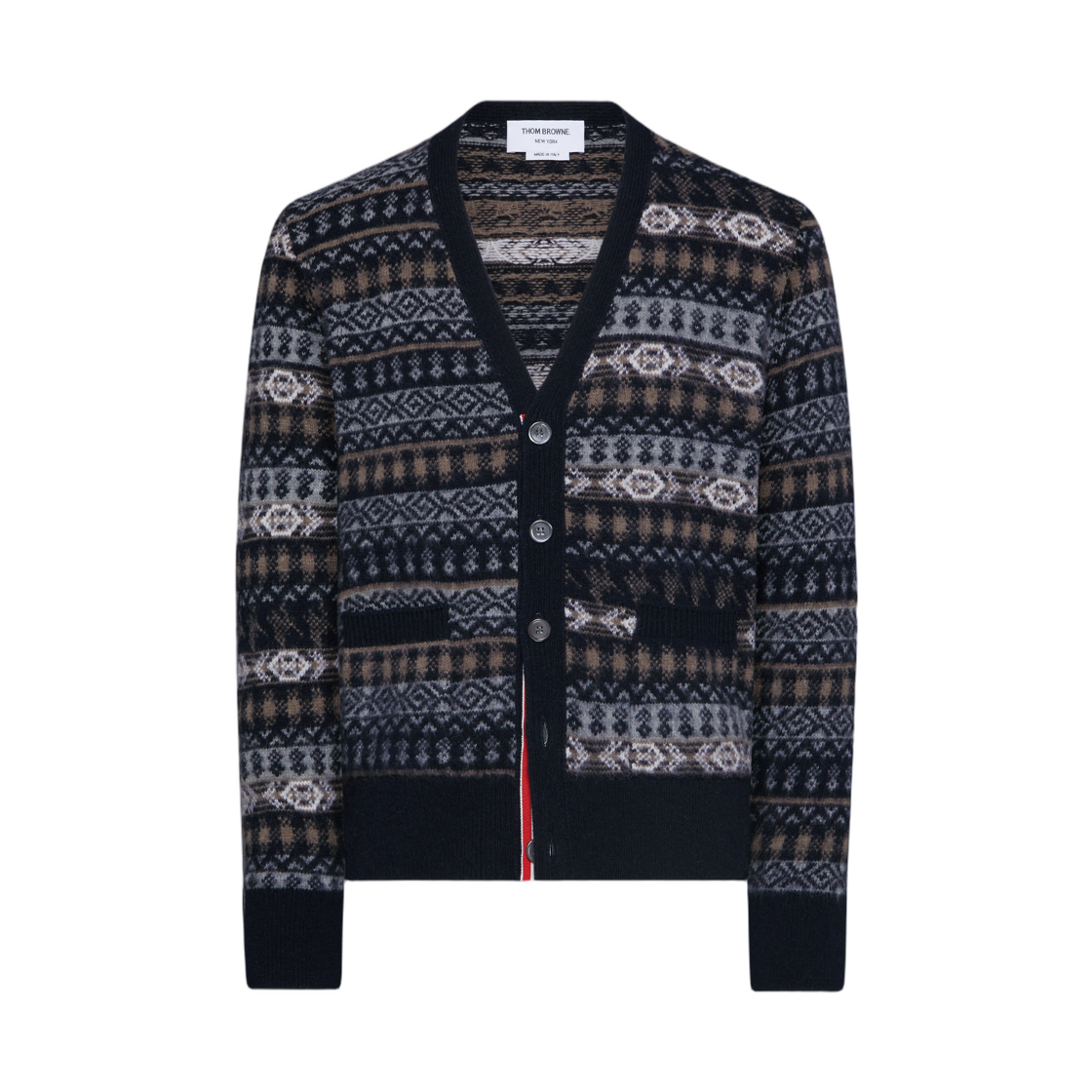 톰브라운 브러쉬드 셰틀랜드 앤 메리노 울 펀믹스 페어 에일 자카드 브이넥 가디건 네이비