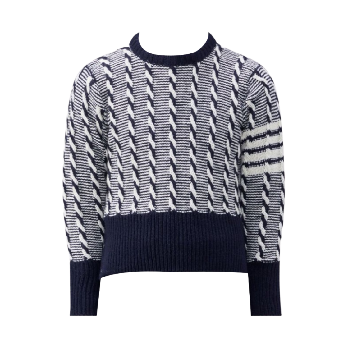 톰브라운 도네갈 바이컬러 트위스트 케이블 사선 크루넥 풀오버 네이비