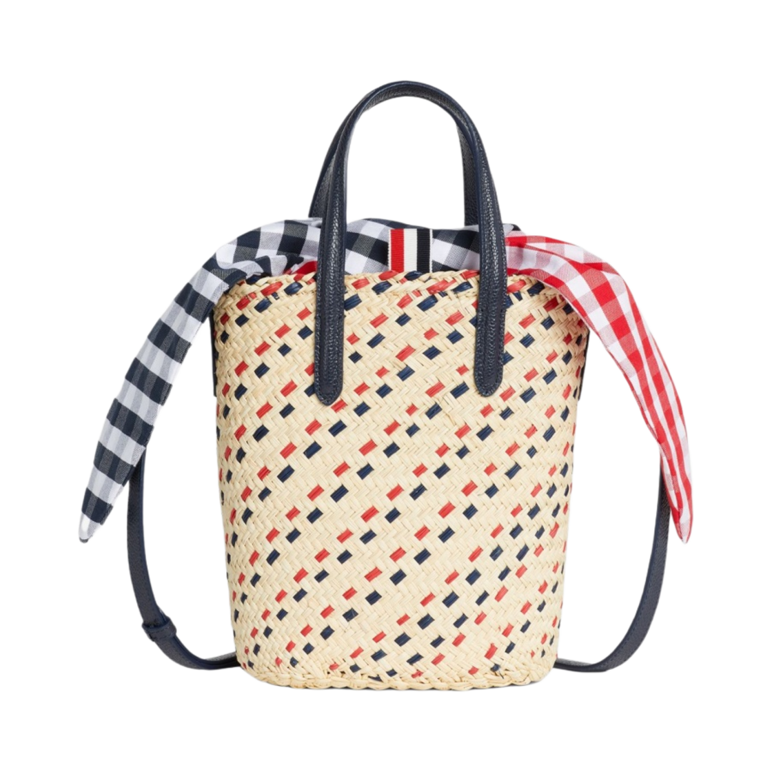 톰브라운 컬러 TK 라피아 스트라이프 자수 깅엄 옥스포드 스카프 크로스바디 미니 버킷 토트백 내츄럴