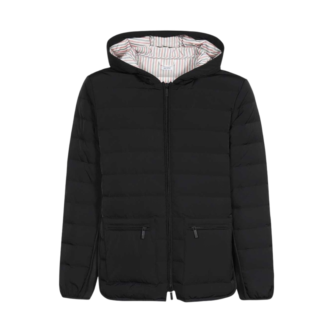 톰브라운 매트 나일론 사선 스트라이프 다운필 퀼티드 후드 자켓 블랙