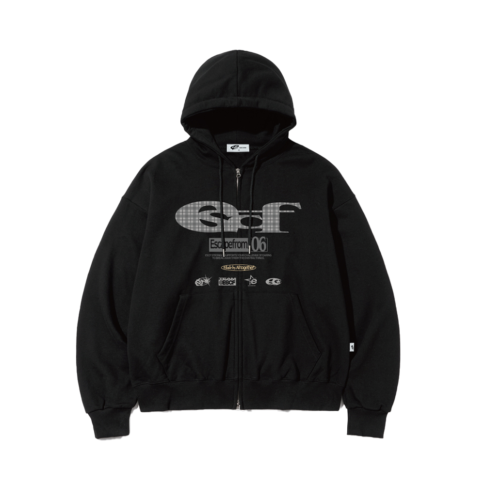 이스케이프프롬 그레이 체크 ESCF 로고 콜라주 프린트 투웨이 후드집업 블랙