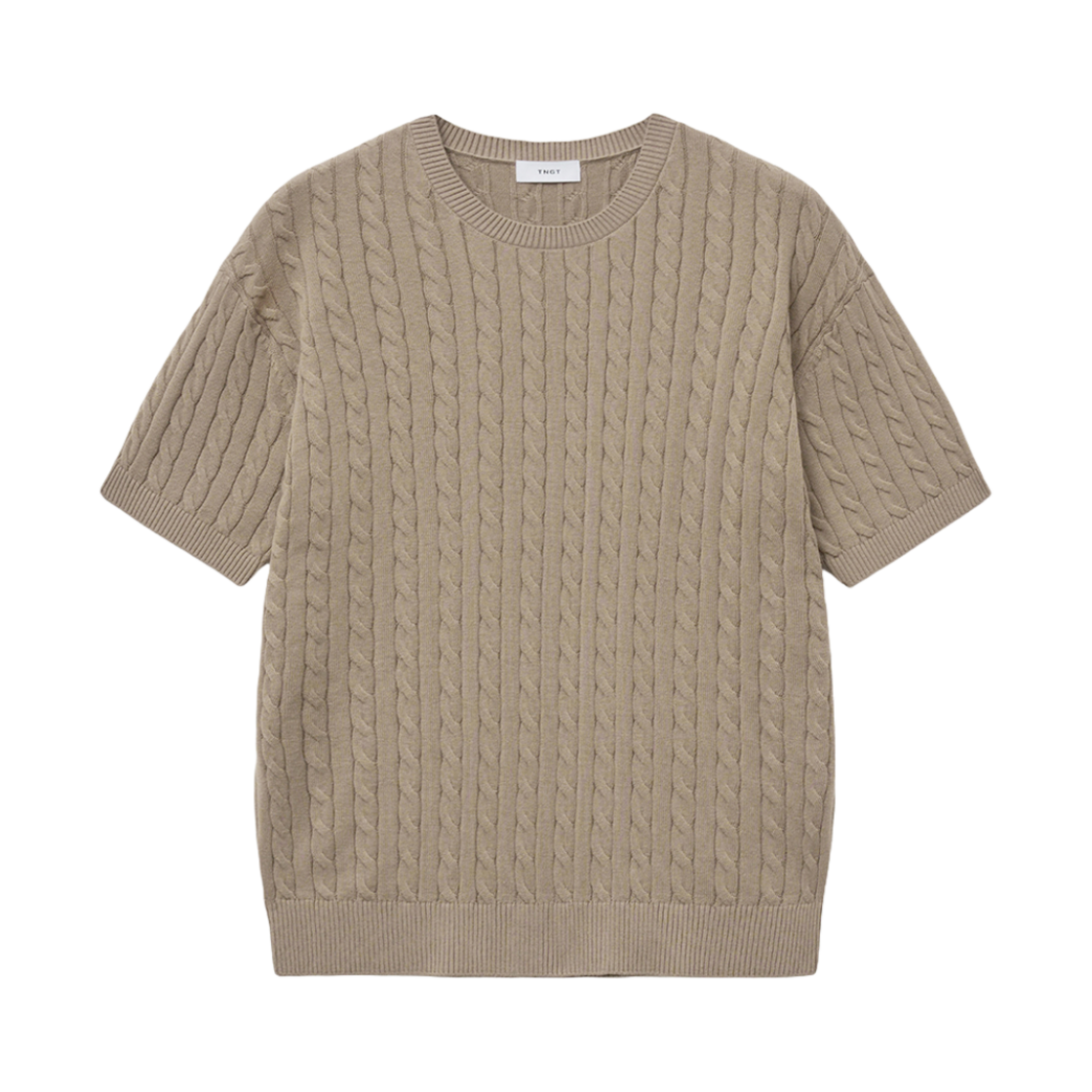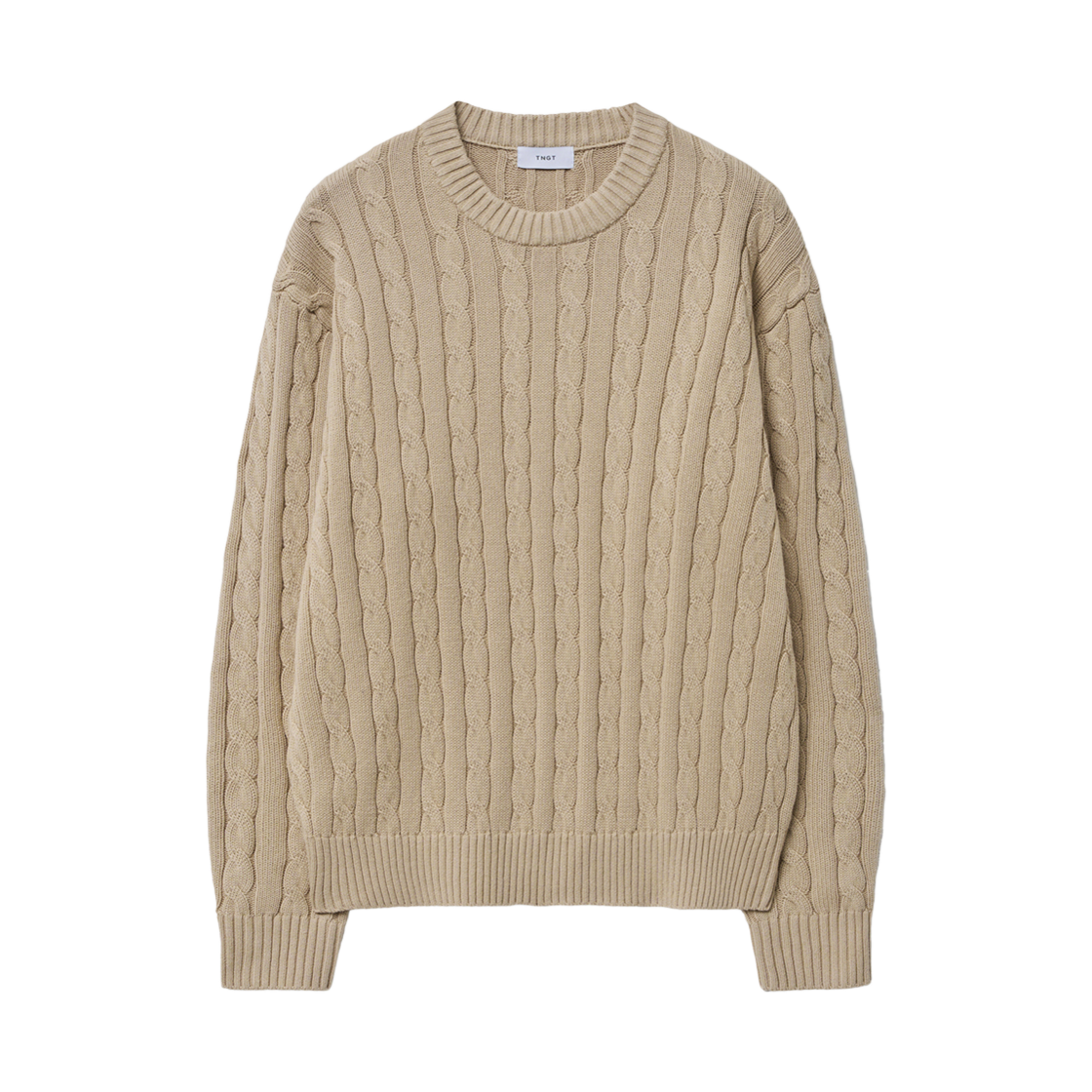 티엔지티 탄 베이지 세미 오버핏 케이블 크루넥 스웨터