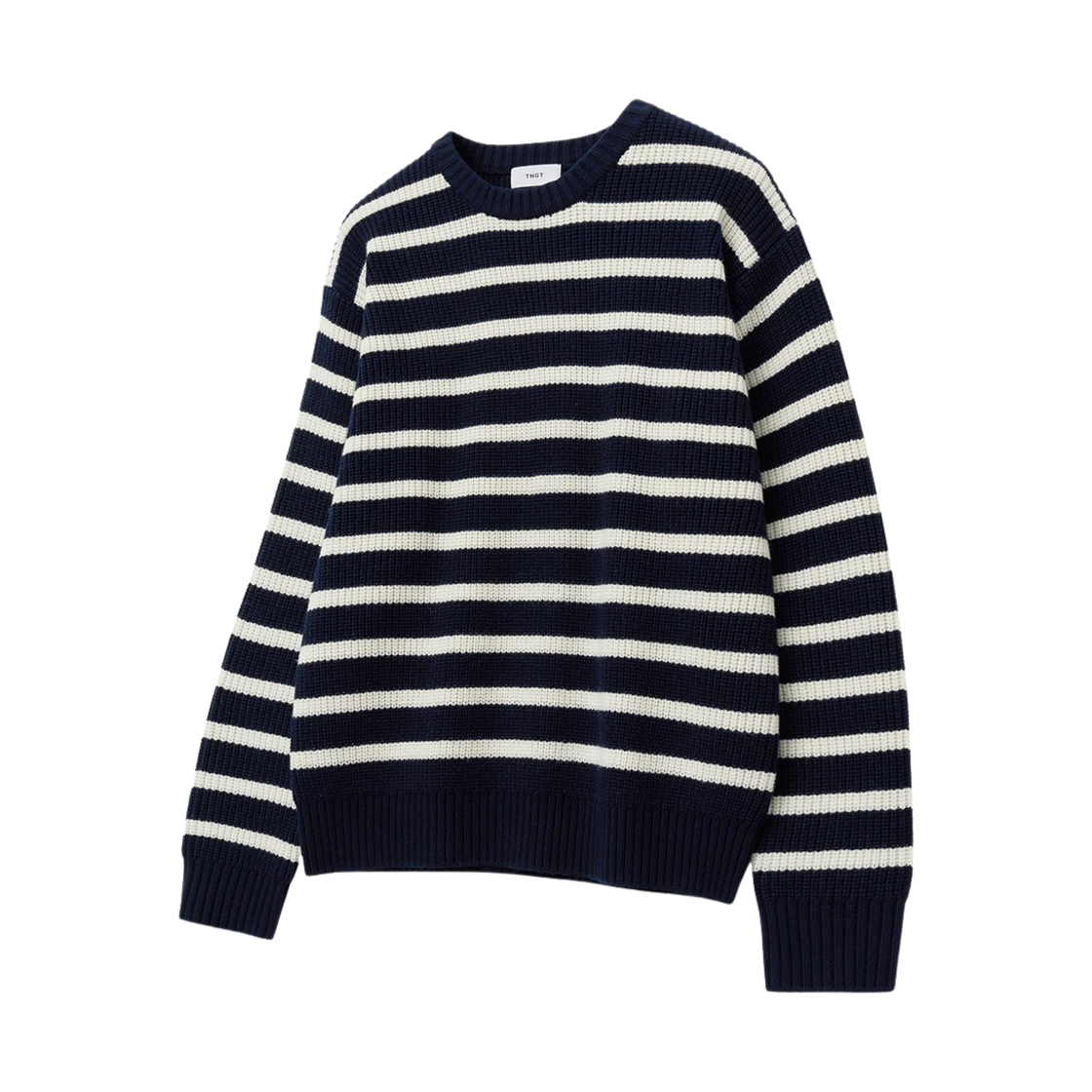 티엔지티 오버핏 와플 스트라이프 니트 네이비