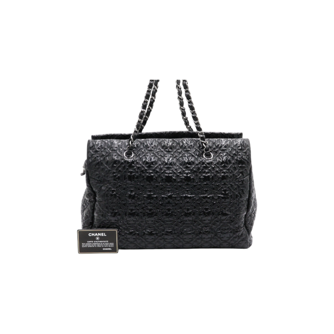샤넬 블랙 페이턴트 까멜리아 로고 은장 체인 숄더백 aa48755