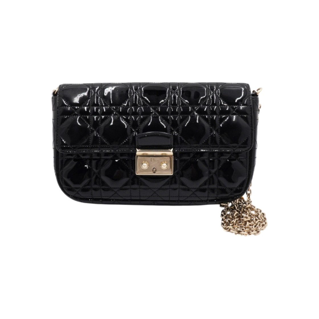 디올 블랙 까나쥬 페이턴트 레더 미스 디올 금장 체인 숄더 스트랩 플랩백 aa57541