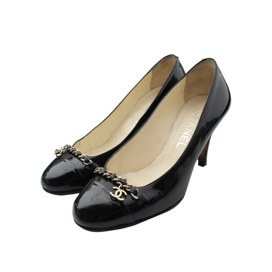샤넬 블랙 페이턴트 금장 체인 펌프스 36C