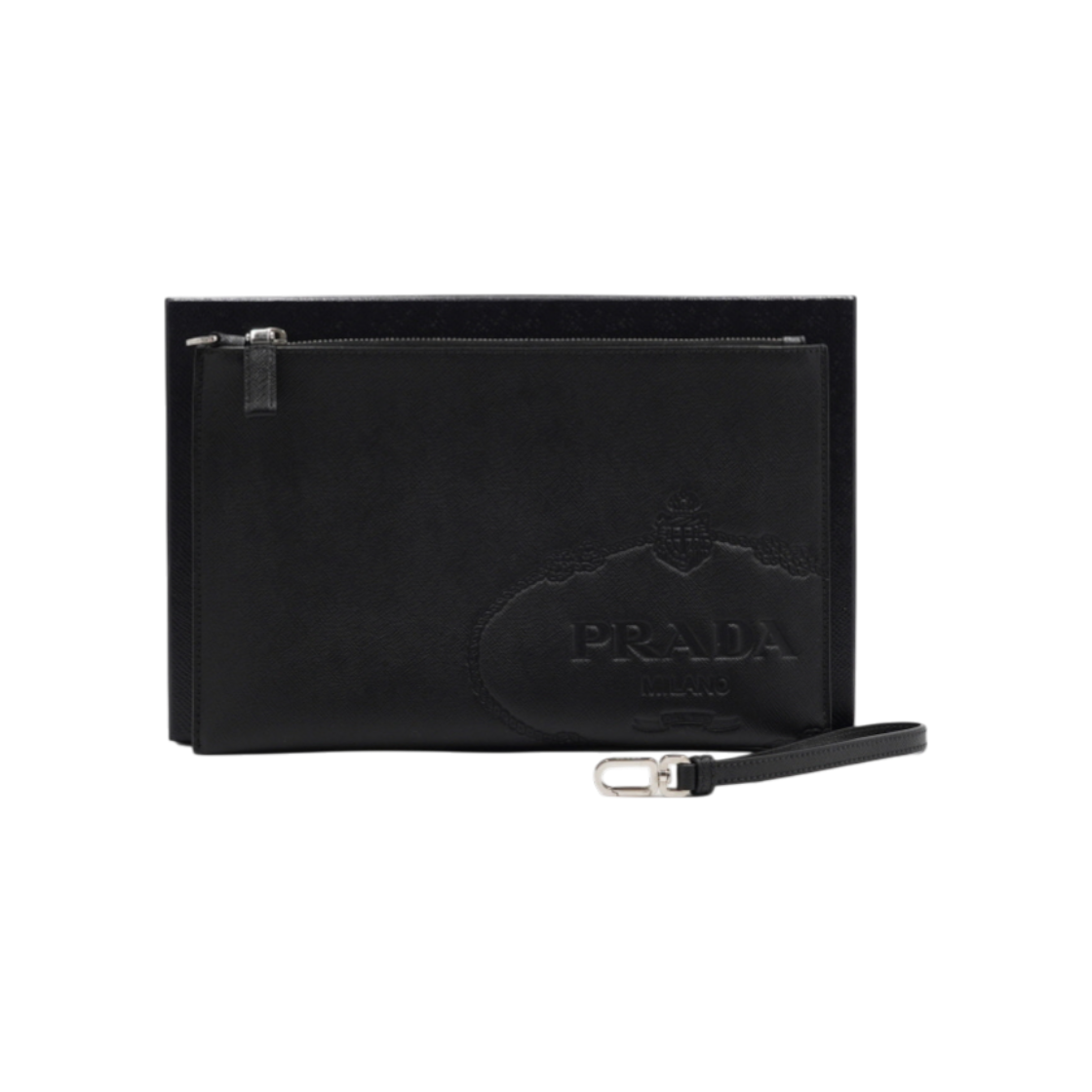 프라다 2NH005 블랙 사피아노 레더 남성 스트랩 파우치 클러치백 aa53099