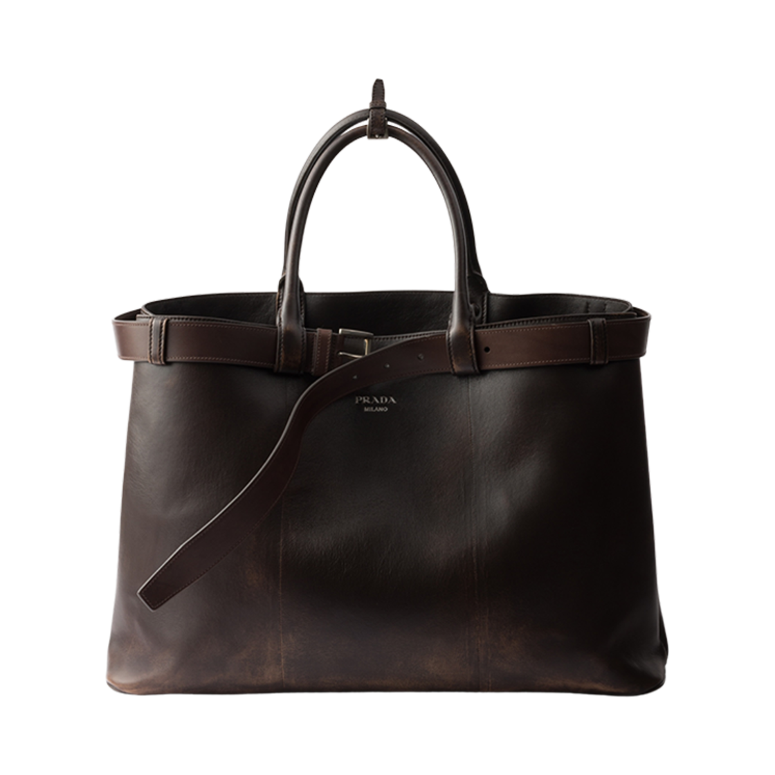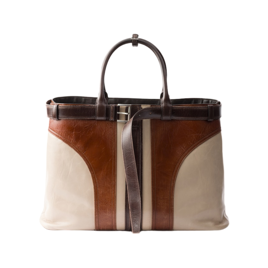 프라다 더블 벨트가 달린 프라다 버클 가죽 핸드백 캐러멜