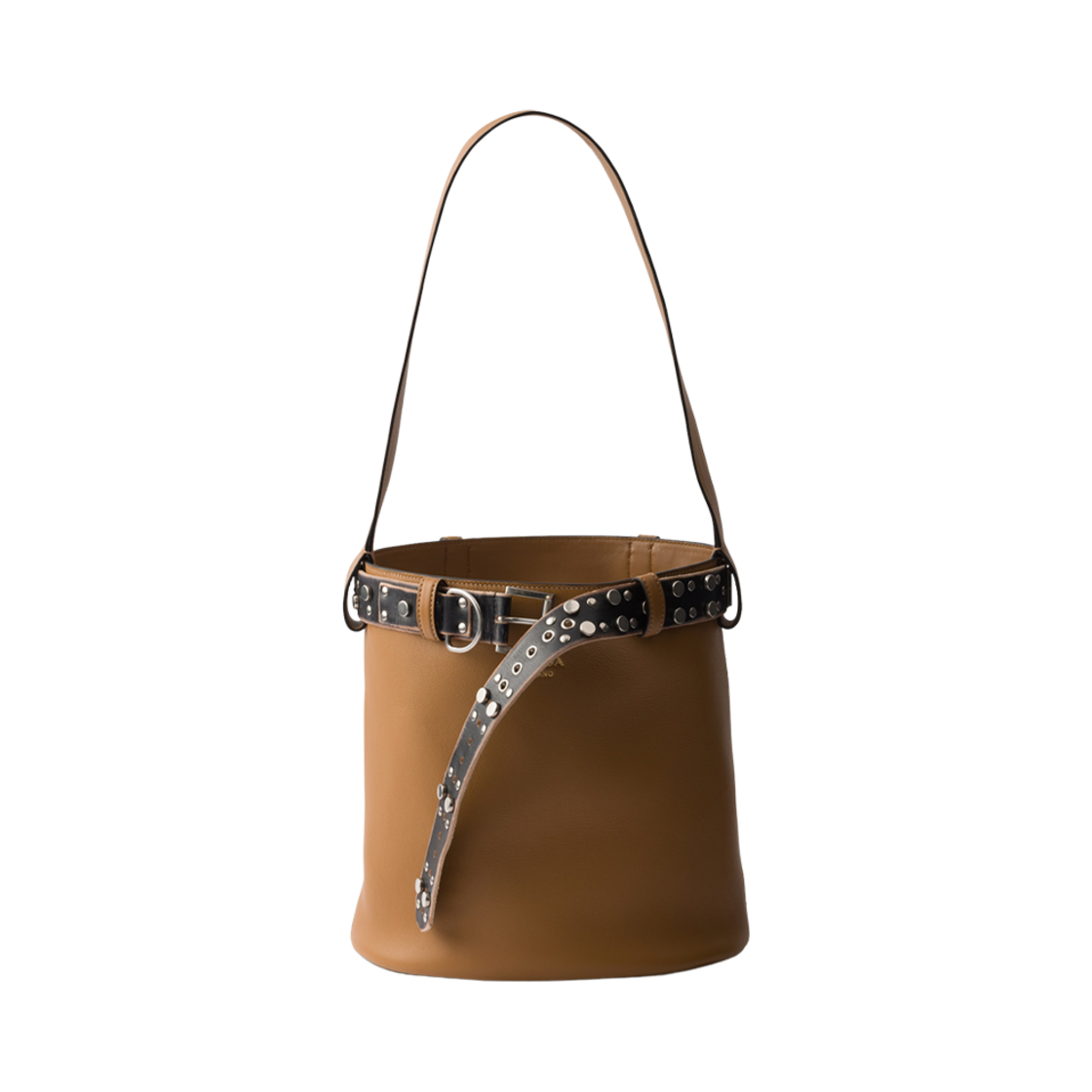 프라다 버클 레더 버킷백 스터디드 벨트 카라멜 블랙