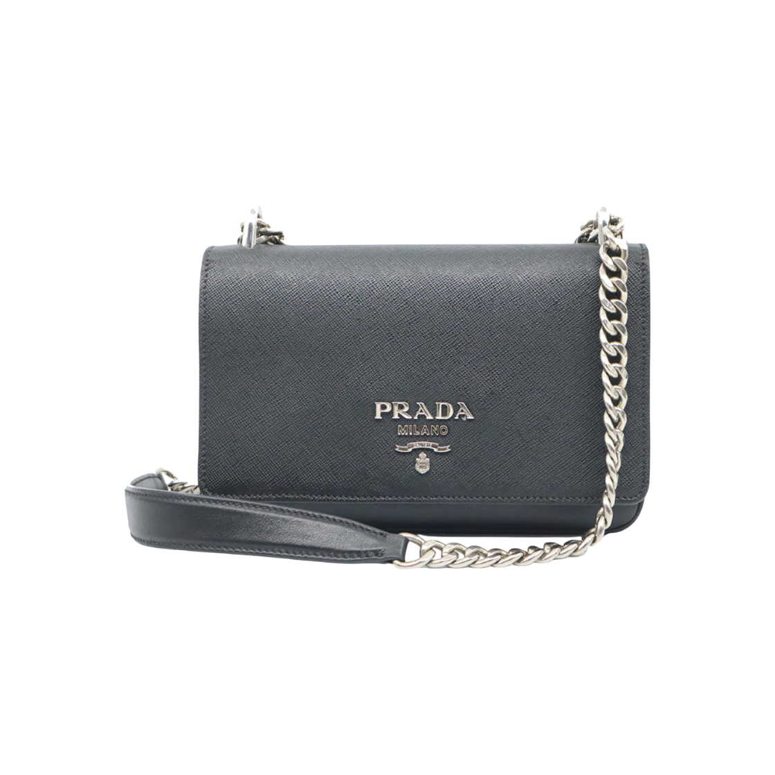 프라다 1BD144 블랙 사피아노 레더 은장 체인 미니 숄더백