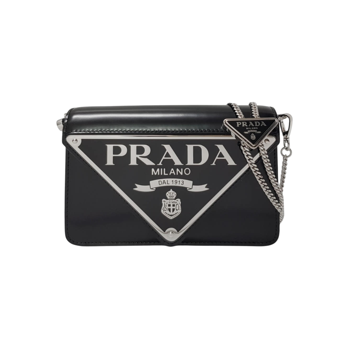 프라다 1BH133 블랙 페이턴트 트라이앵글 락 장식 금장 체인 숄더백 겸 크로스백 aa57209