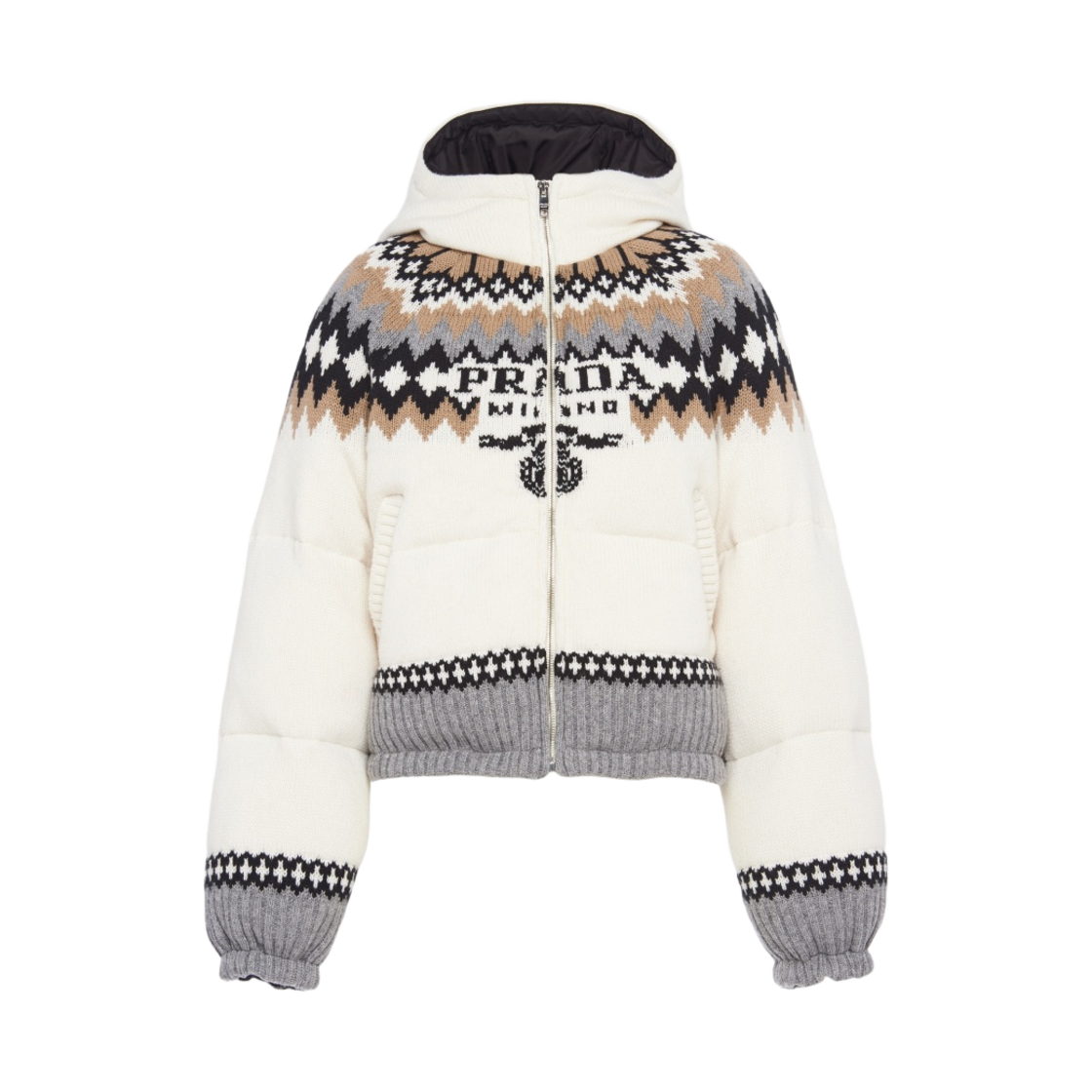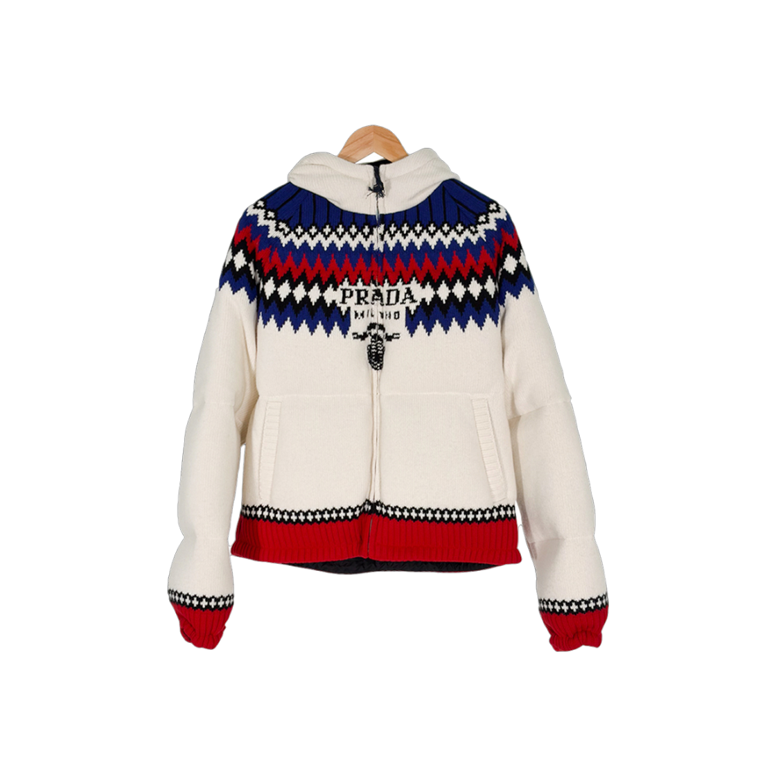 프라다 자수로고 울 캐시미어 니트 다운 후드 패딩 자켓 화이트