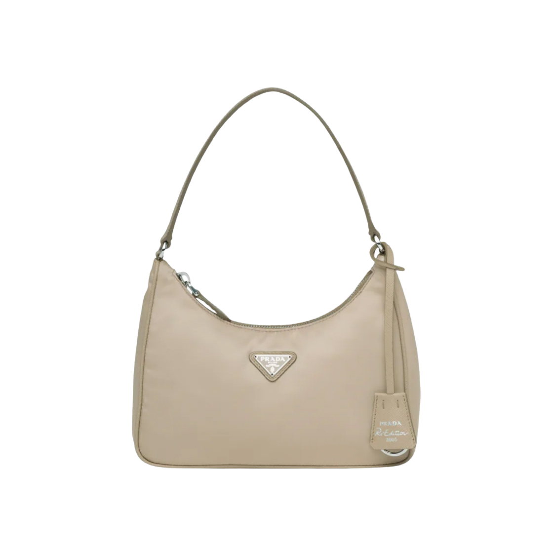 프라다 리에디션 2005 사피아노 트리밍 리나일론 미니 호보백 데저트 베이지