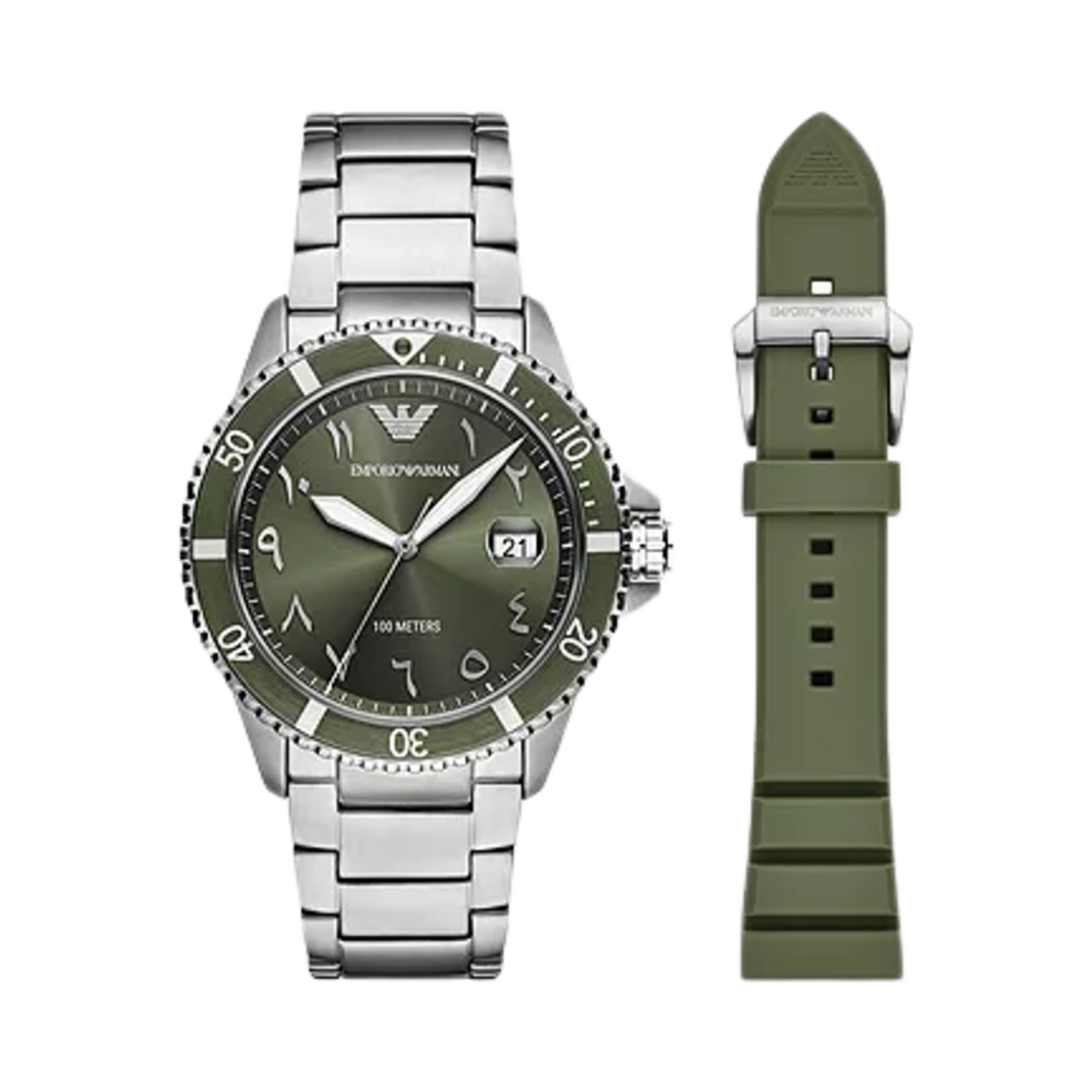 엠포리오 아르마니 월드 익스프로어 쓰리핸드 데이트 41mm 스테인리스 스틸 실리콘 스트랩 세트 그린