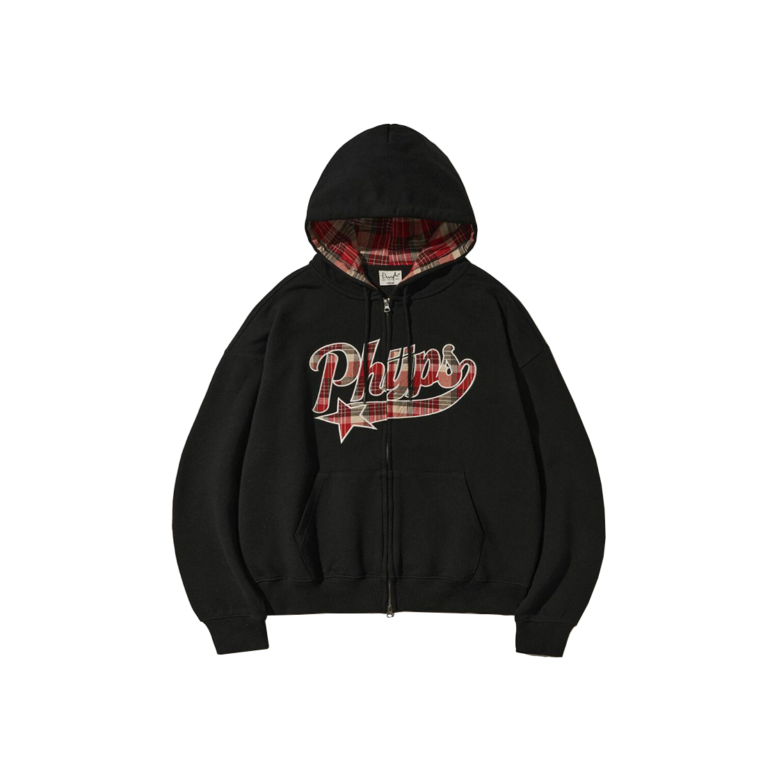 피지컬 디파트먼트 체크 스타테일 엘보우 패치 후드집업 블랙