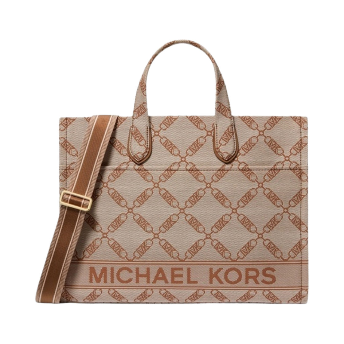 마이클 코어스 지지 라지 엠파이어 로고 자카드 토트백 베이지 카우하이드 브라운