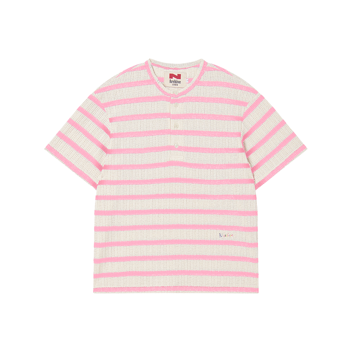 엔 아카이브 럭스 코튼 스트라이프 헨리넥 반팔 니트 핑크
