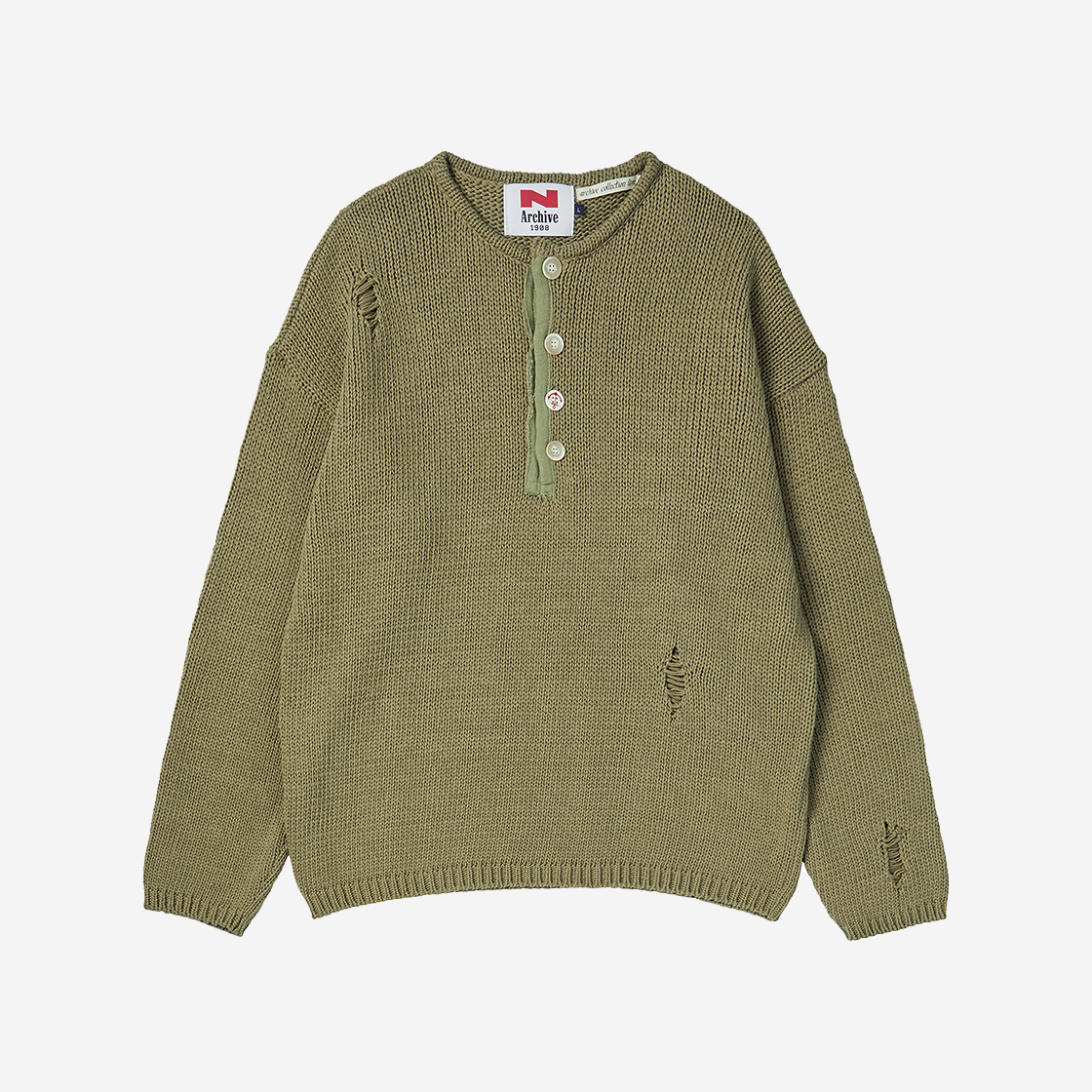 엔 아카이브 아카이브 헤비 웨이트 코튼 데미지 디테일 헨리넥 니트 카키