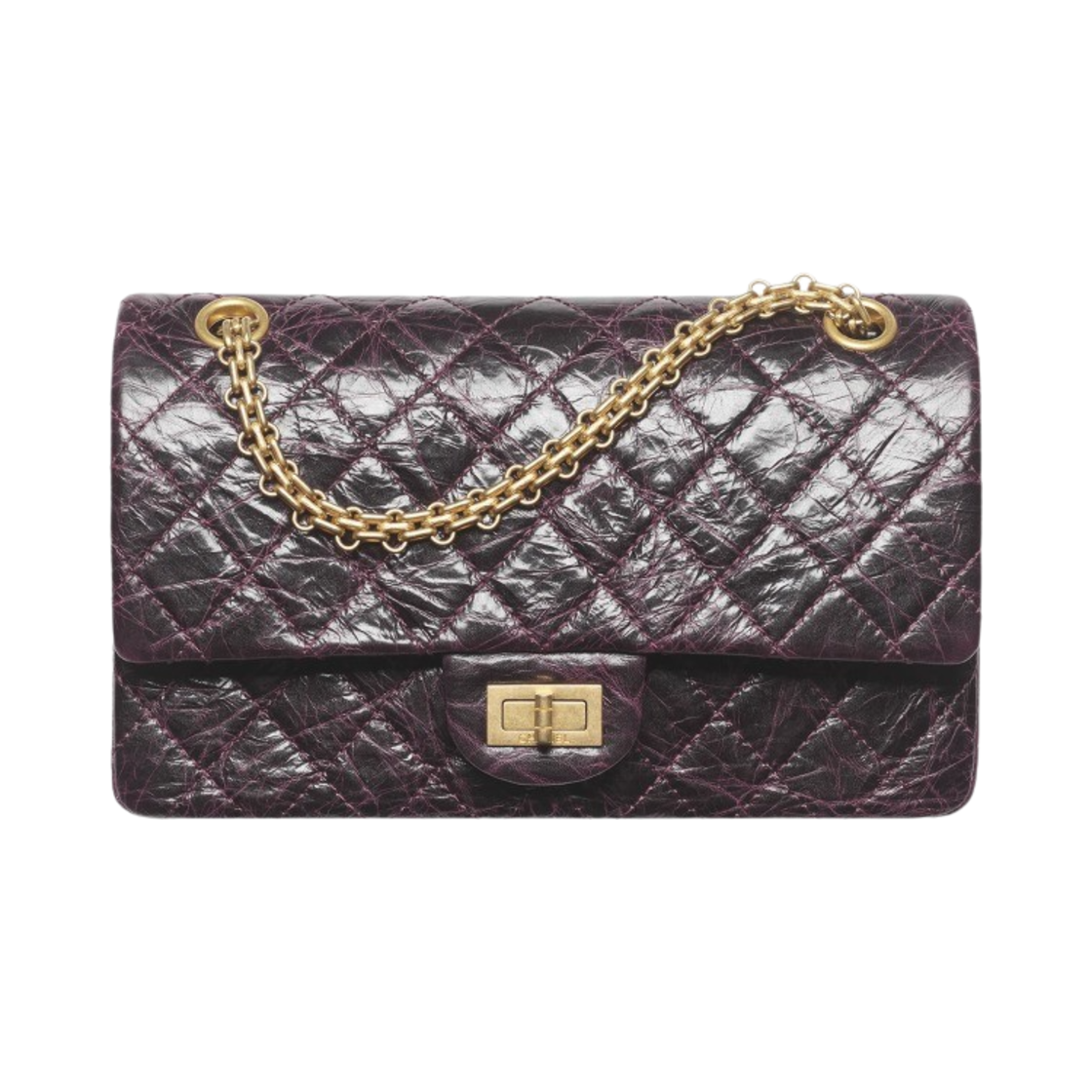 샤넬 2.55 핸드백 샤이니 크럼플드 카프스킨 골드 메탈 & 다크 퍼플