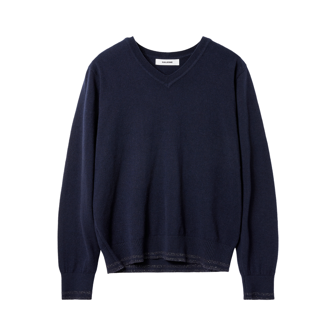 알렌느 메탈릭 트림 브이넥 니트 네이비