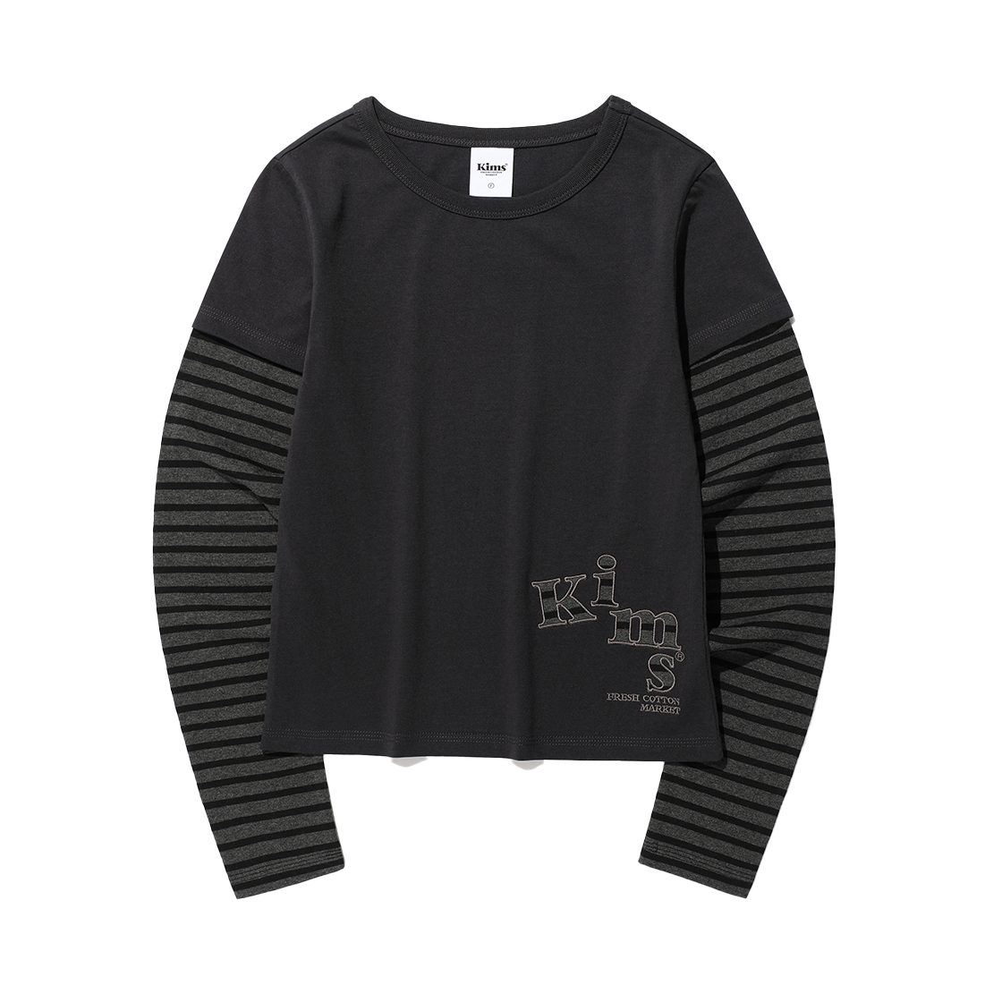 킴스프레시코튼마켓 34 스트라이프 레이어드 아플리케 롱슬리브 긴팔티셔츠 차콜