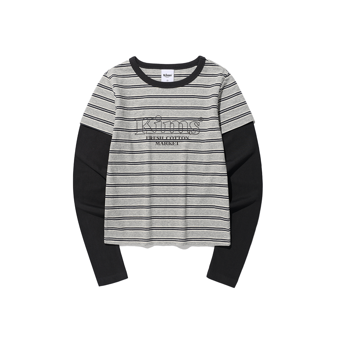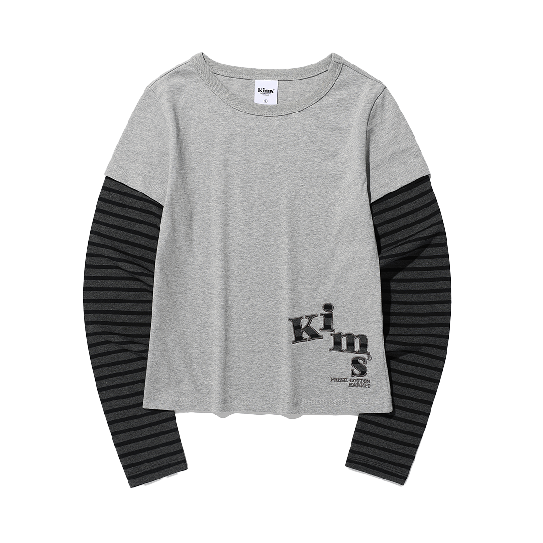 킴스프레시코튼마켓 34 스트라이프 레이어드 아플리케 롱슬리브 긴팔티셔츠 그레이