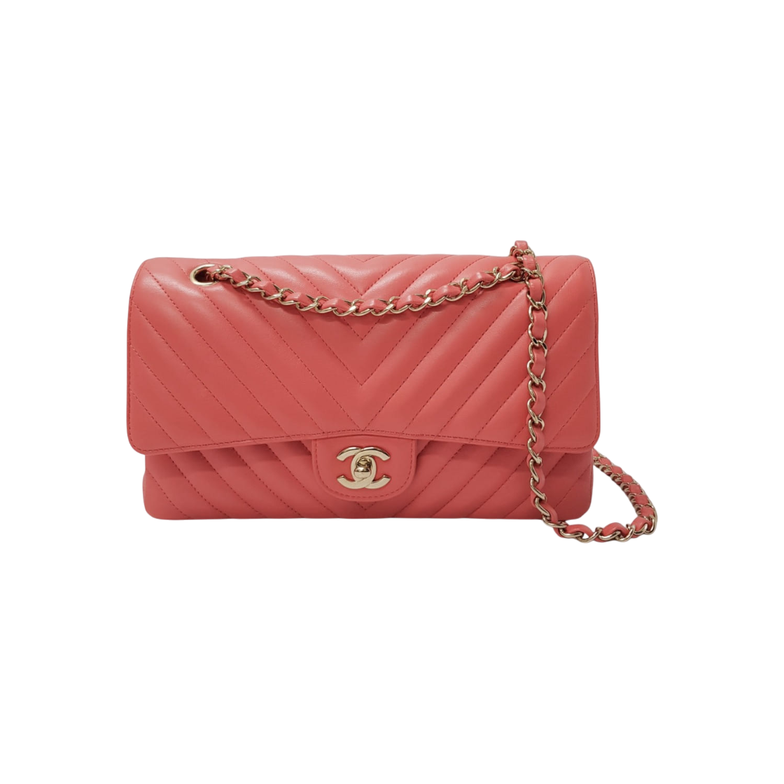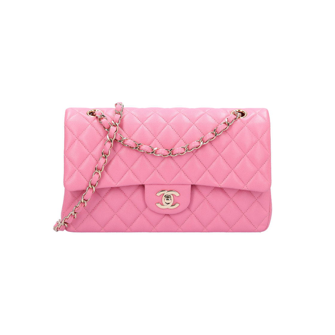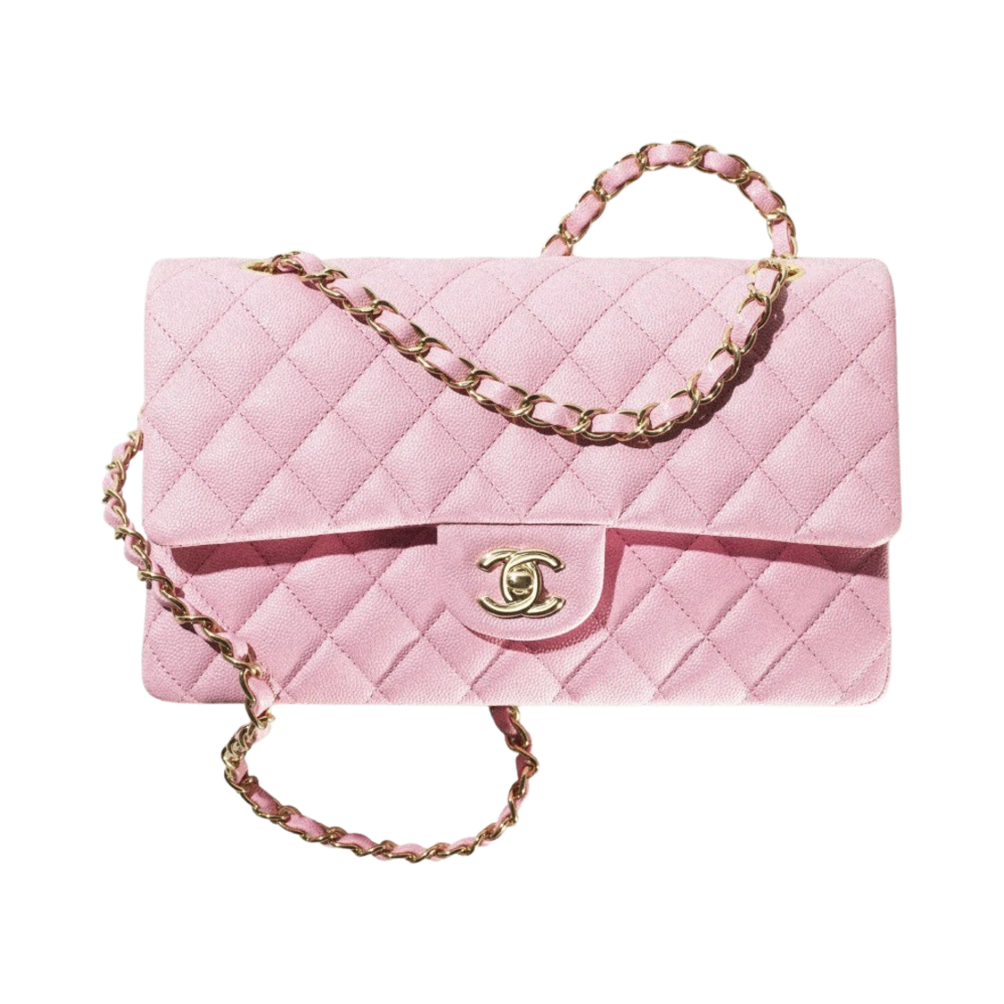 샤넬 클래식 미디움 플랩백 그레인드 샤이니 카프스킨 & 골드 메탈 핑크