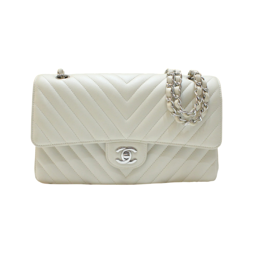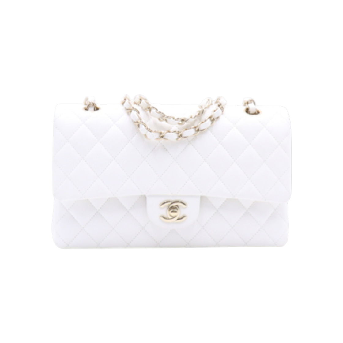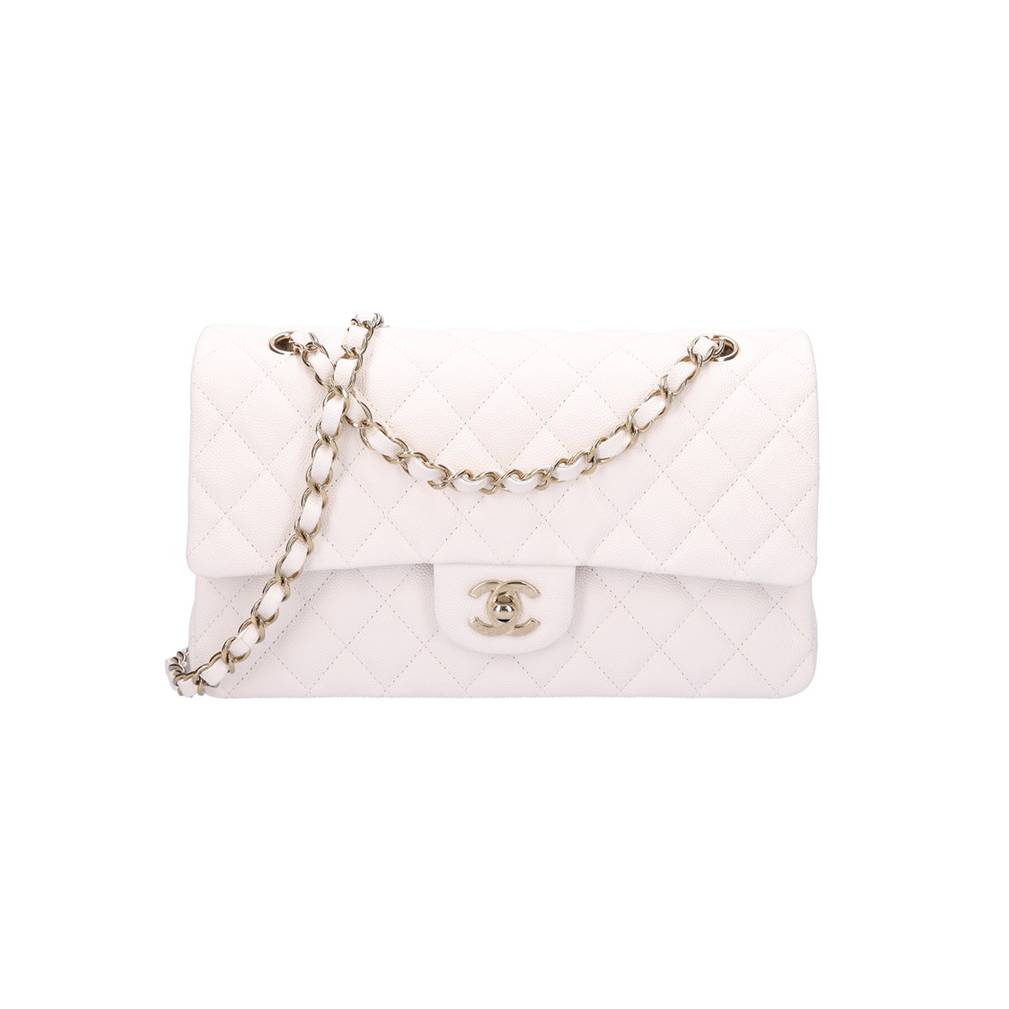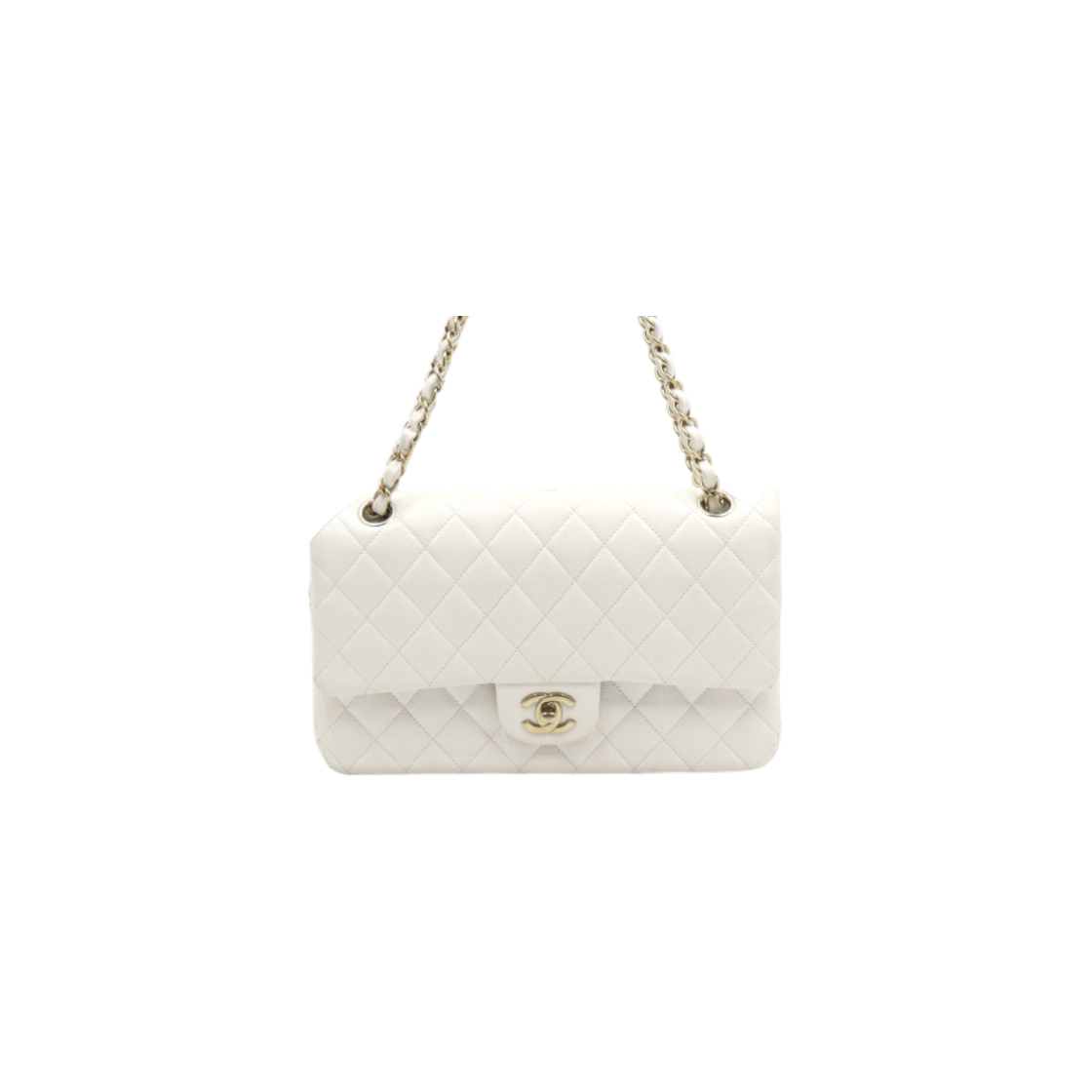 샤넬 클래식 미디움 플랩백 그레인드 카프스킨 & 골드 메탈 화이트