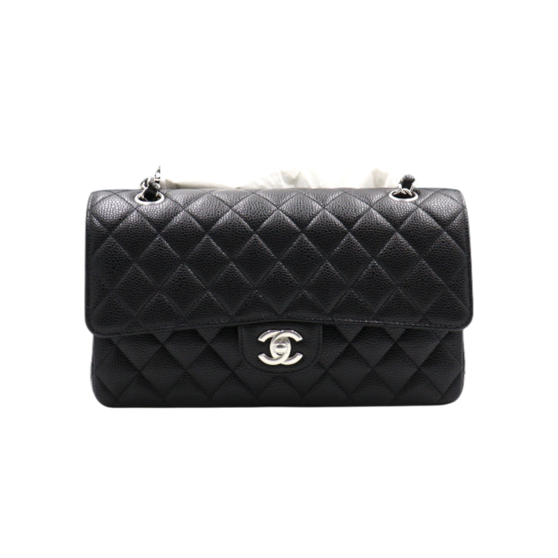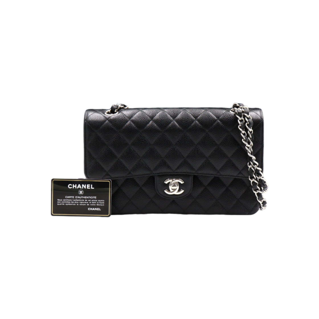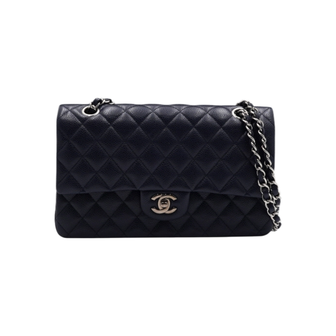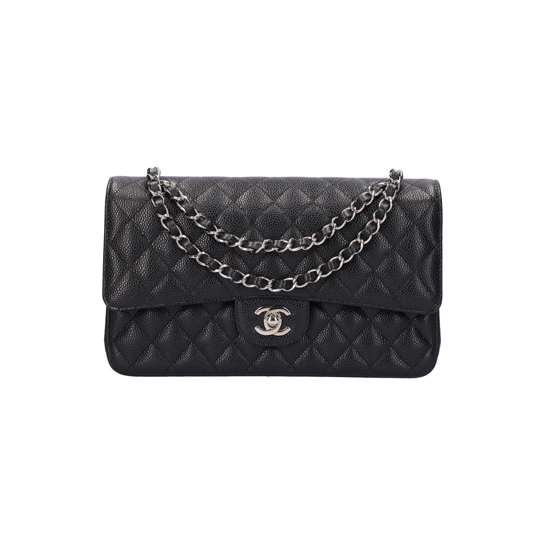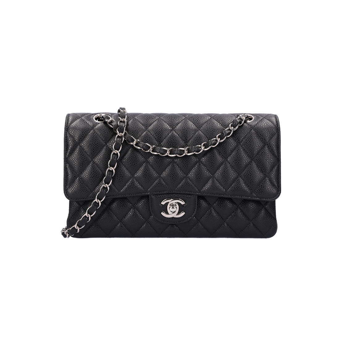 샤넬 클래식 미디움 플랩백 그레인드 카프스킨 & 실버 메탈 블랙