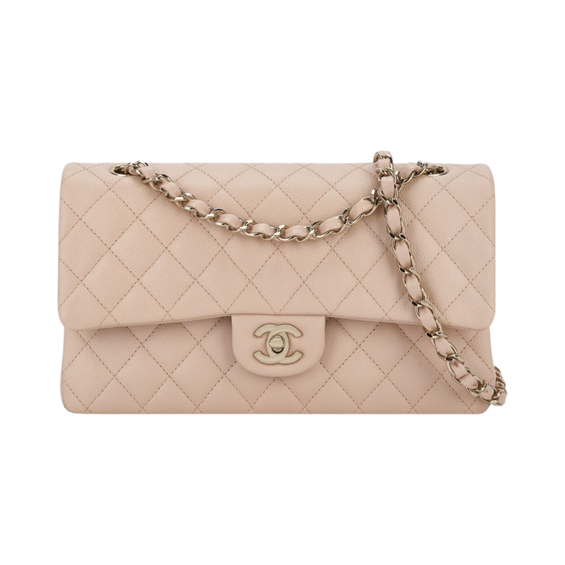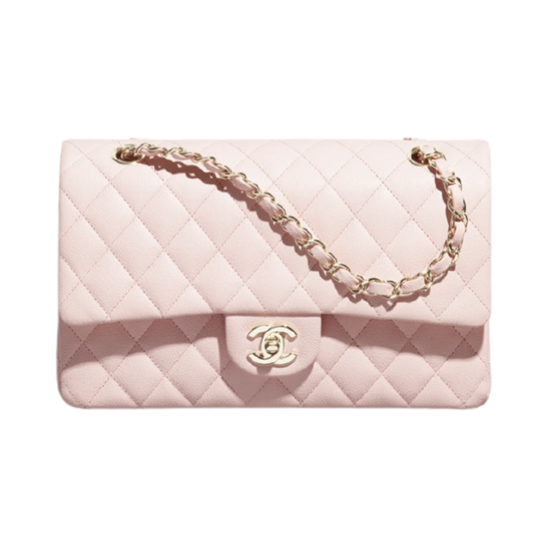 샤넬 클래식 미디움 플랩백 그레인드 카프스킨 & 골드 메탈 라이트 핑크
