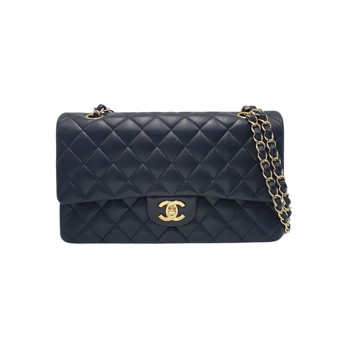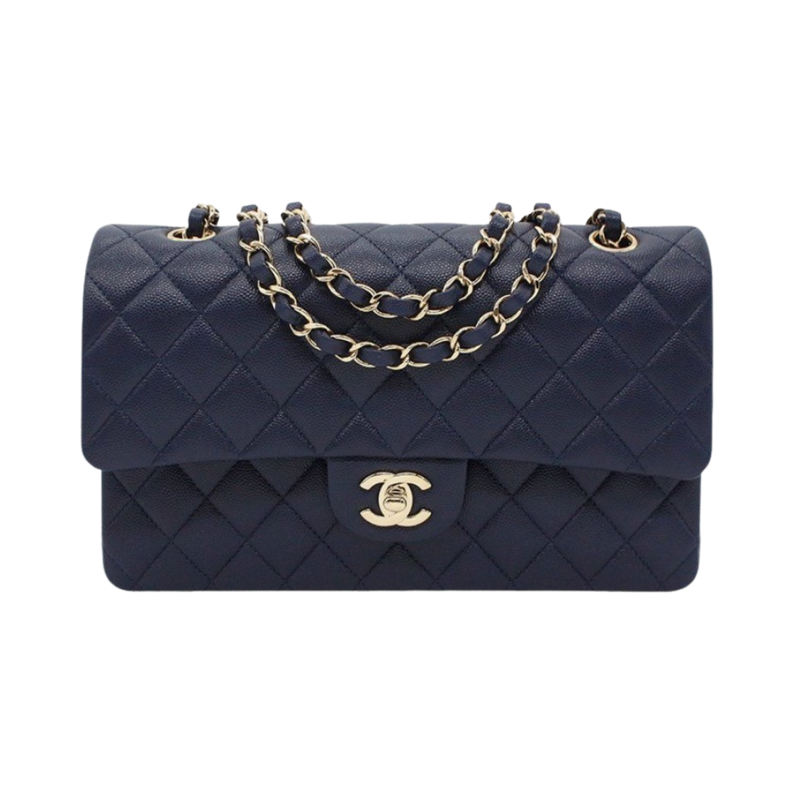 샤넬 클래식 미디움 플랩백 그레인드 카프스킨 & 골드 메탈 네이비 블루